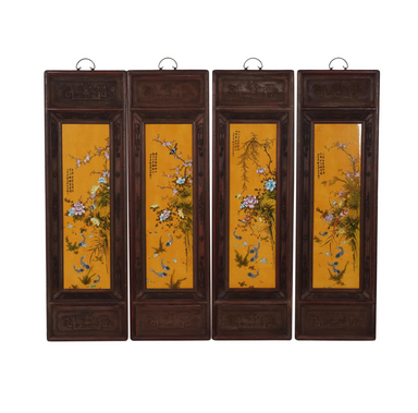 Antique Late 19th Century Chinese Four Panel Screen Comprised of Hand Carved Wood Frames Enclosing Hand Painted Porcelain Flora and Fauna Decorated...