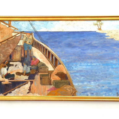 Fritz Schwaderer (American/California, 1901-1974) "Men on Dock" Expressionist Oil on Canvas Laid to Board Circa 1960's. Signed "SCHWADERER" lower r...