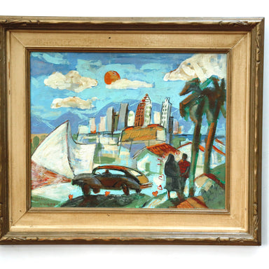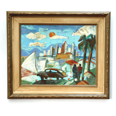Richard Valdes Romance in the City of Los Angeles Acrylic on Board. Signed lower left. Signed and titled verso "Romance in the City of Los Angeles ...
