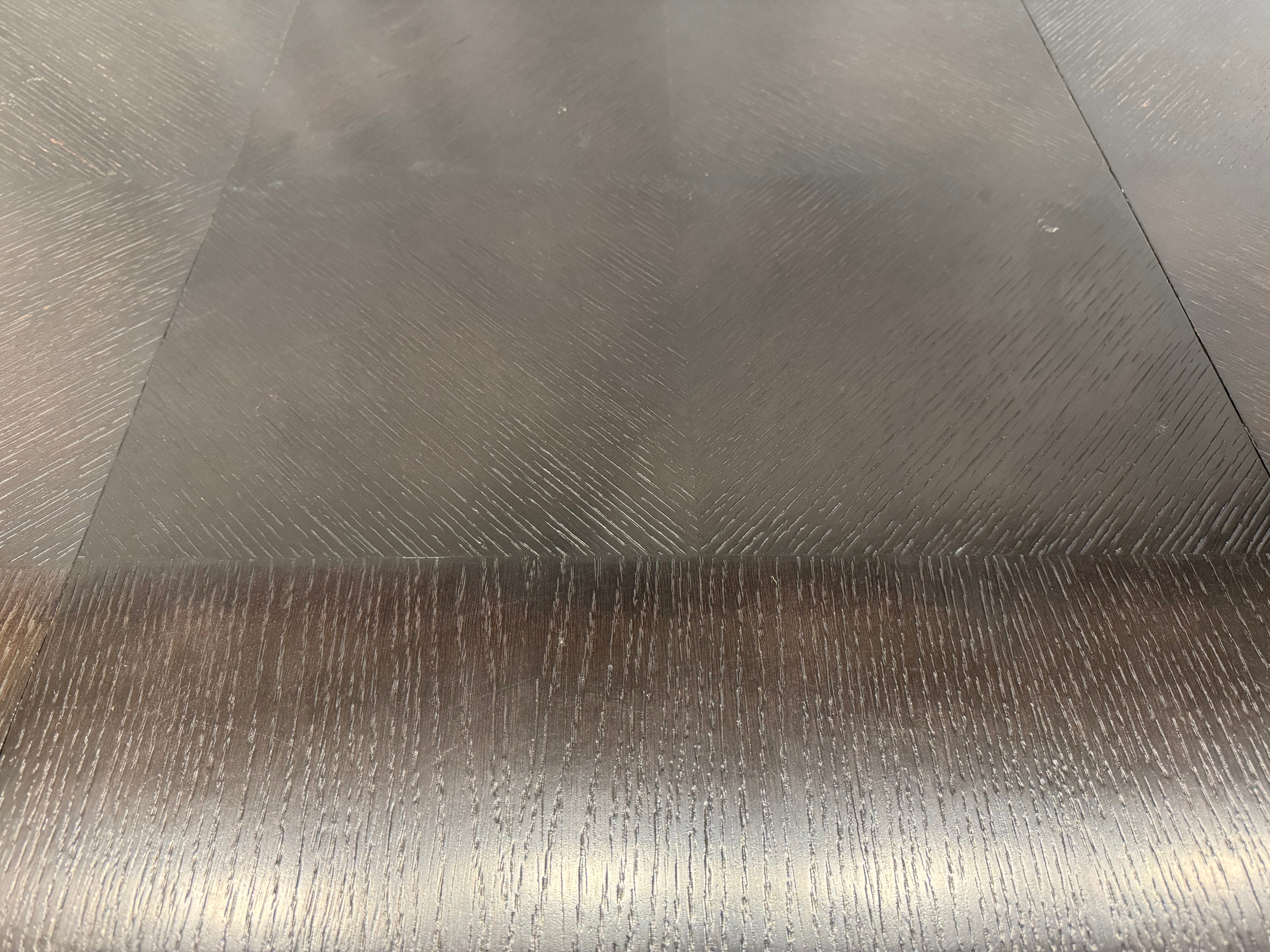 Late 20th Century Emanuel Morez Klismos ebonized parquetry oak dining table, having two 20" leaves, above a pedestal base