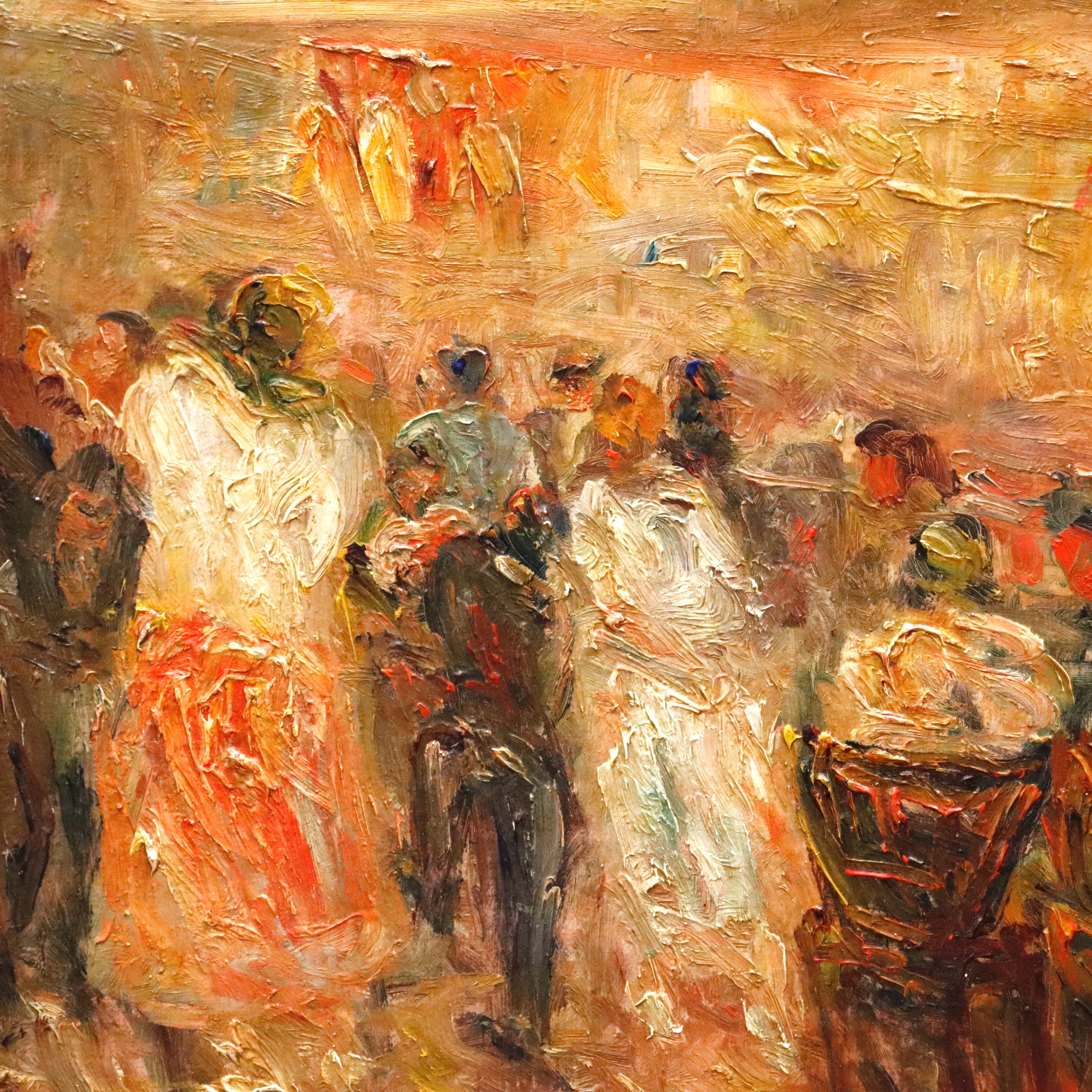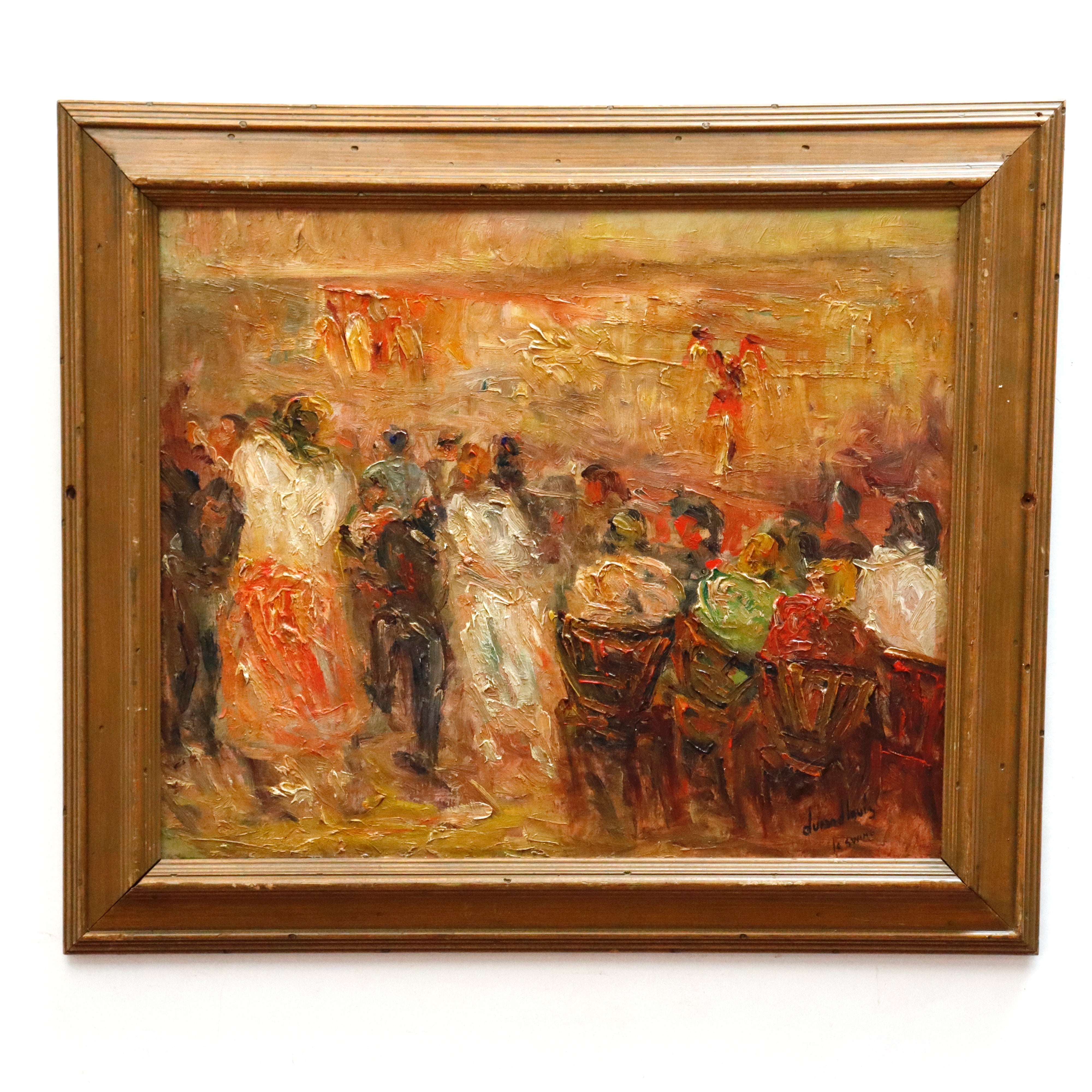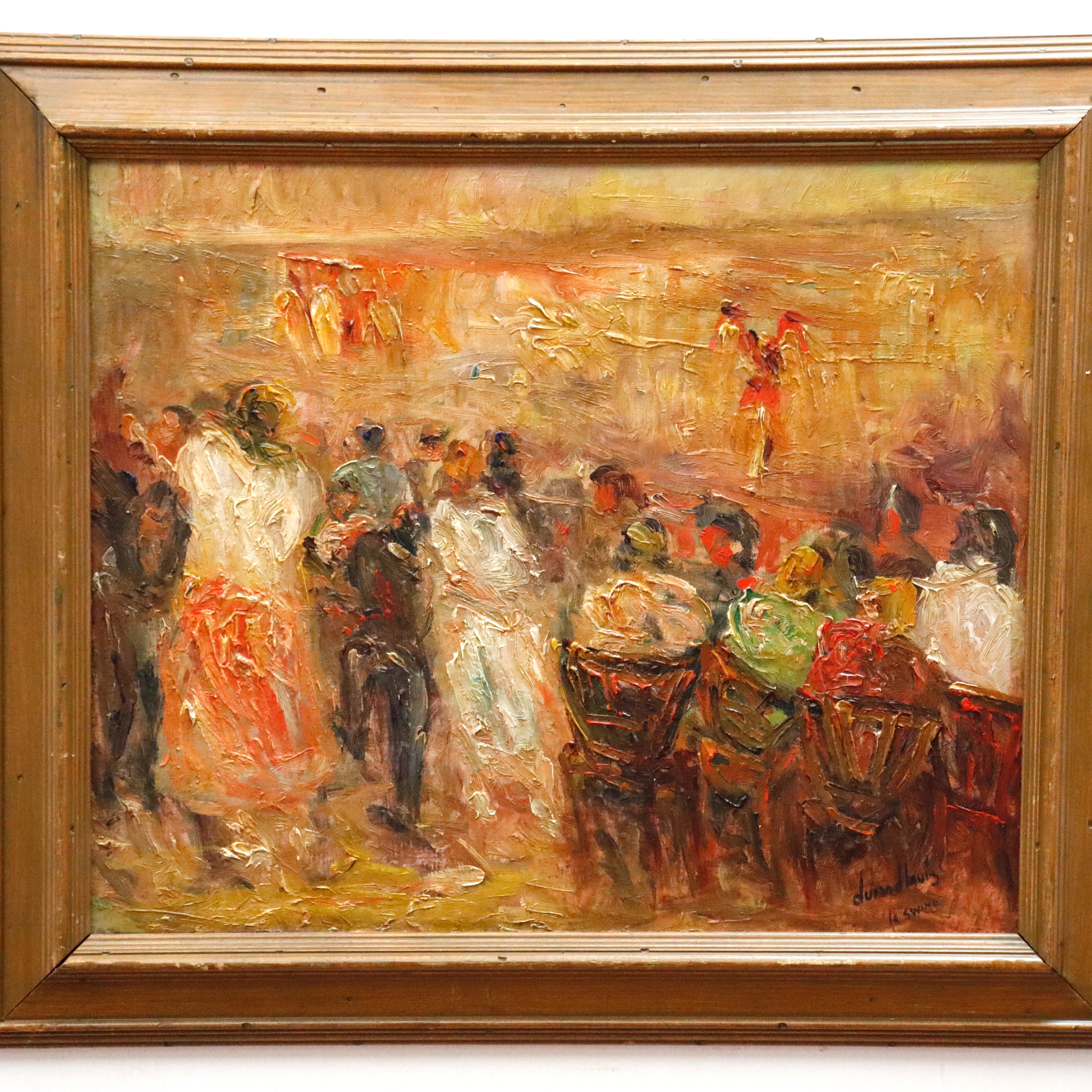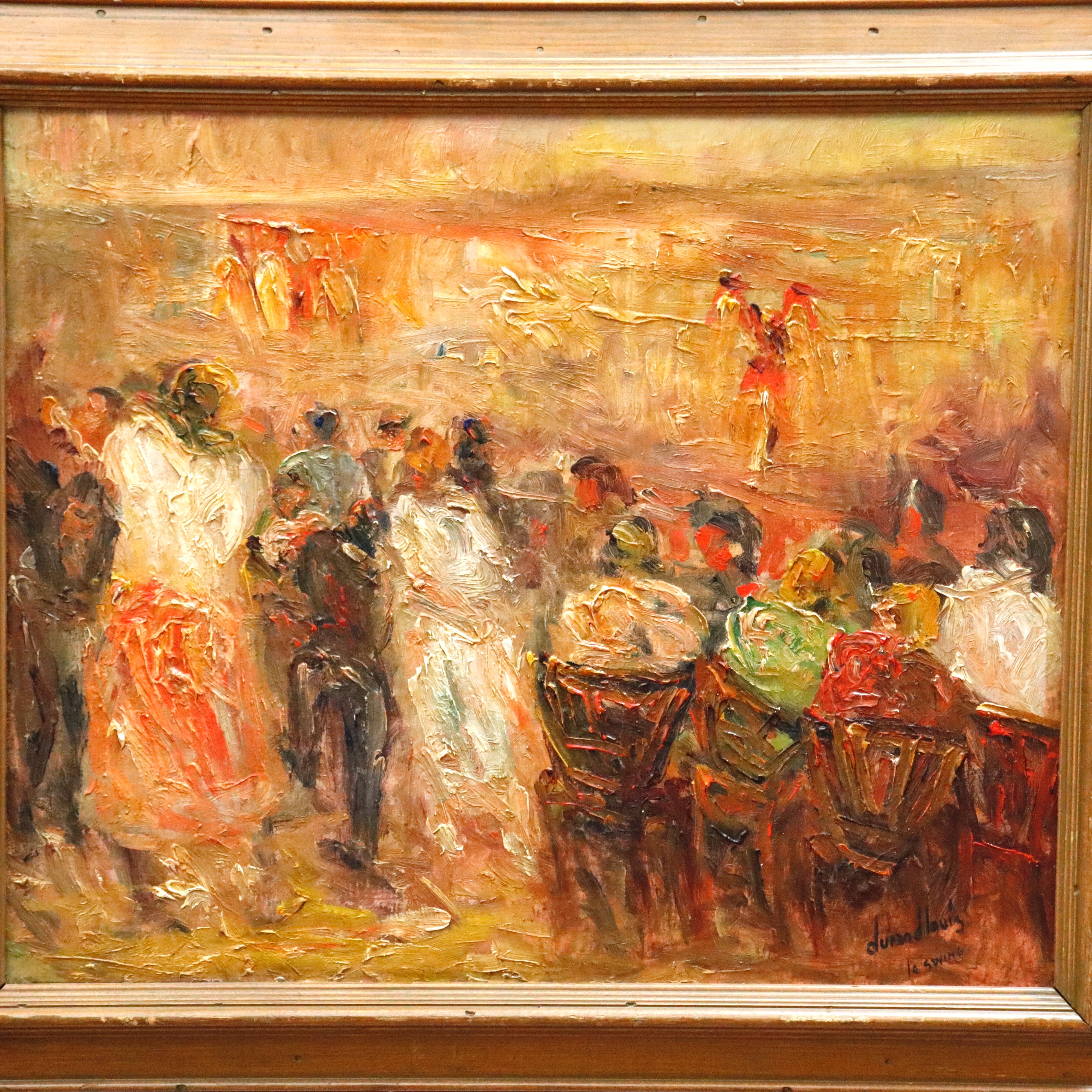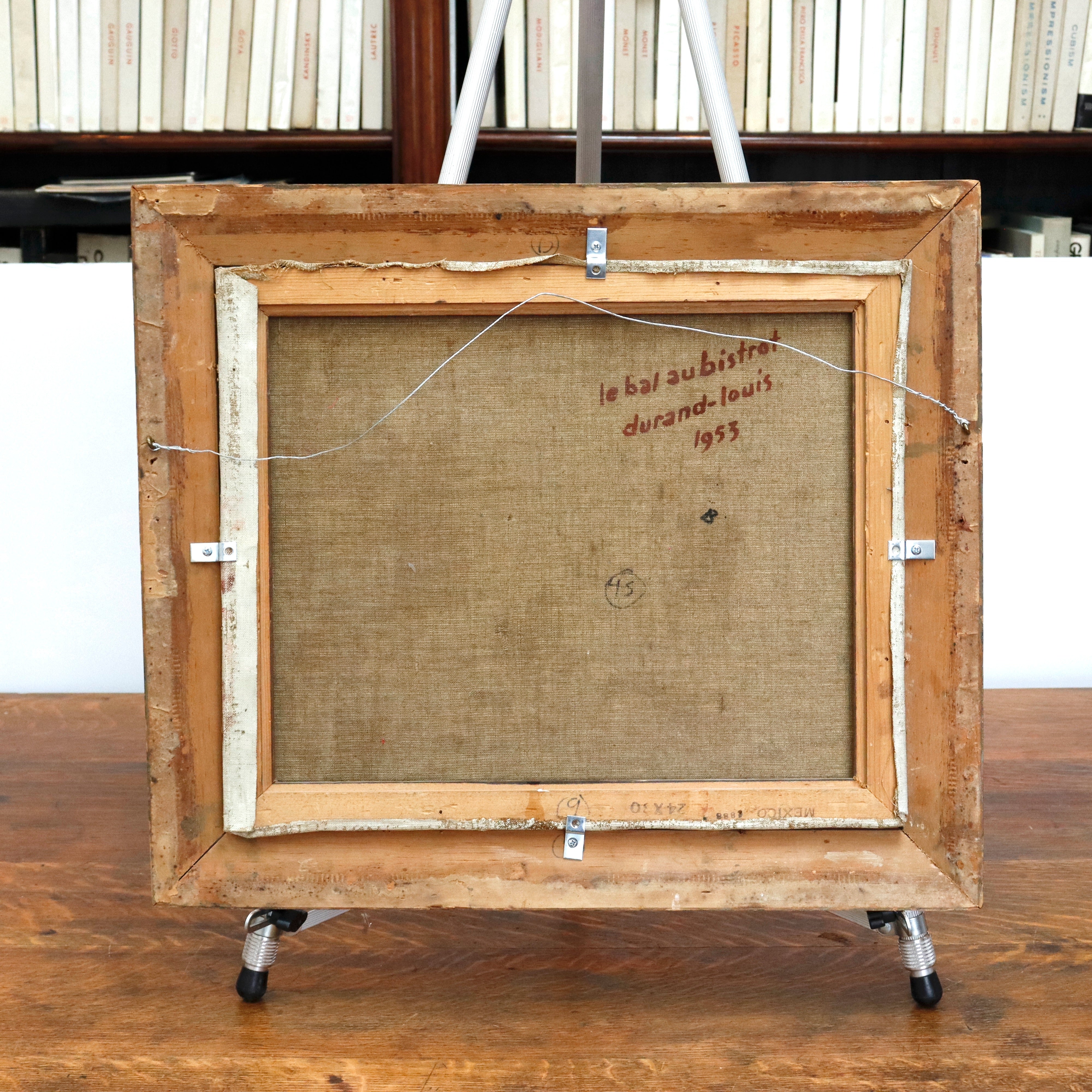 Louis Albert Durand French Bistro Oil on Canvas Painting Circa 1953. Signed lower right. Signed, Titled "le bal aubistrot" & dated 1953 verso canvas. Presented in a vintage period frame (note screw holes on sides of frame)