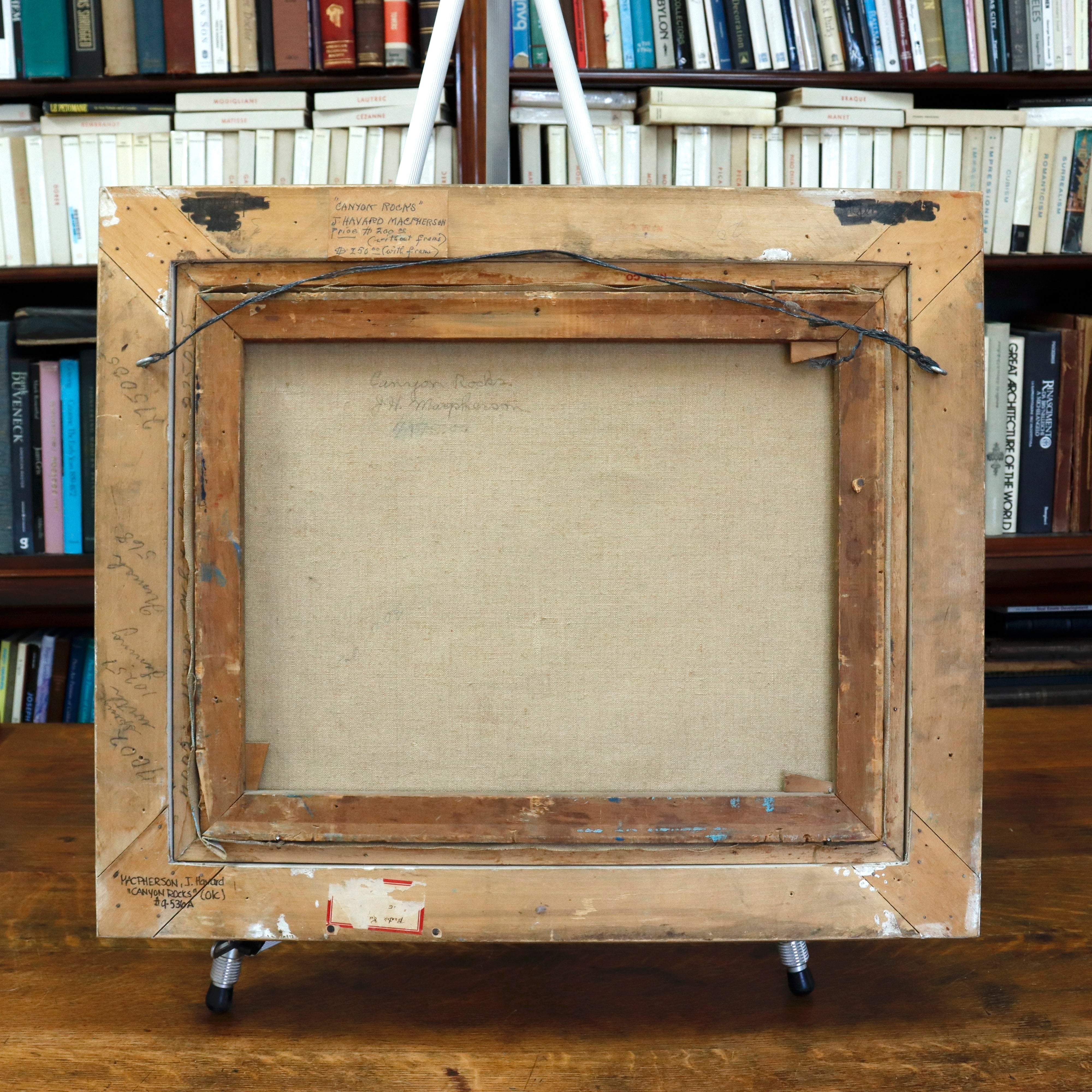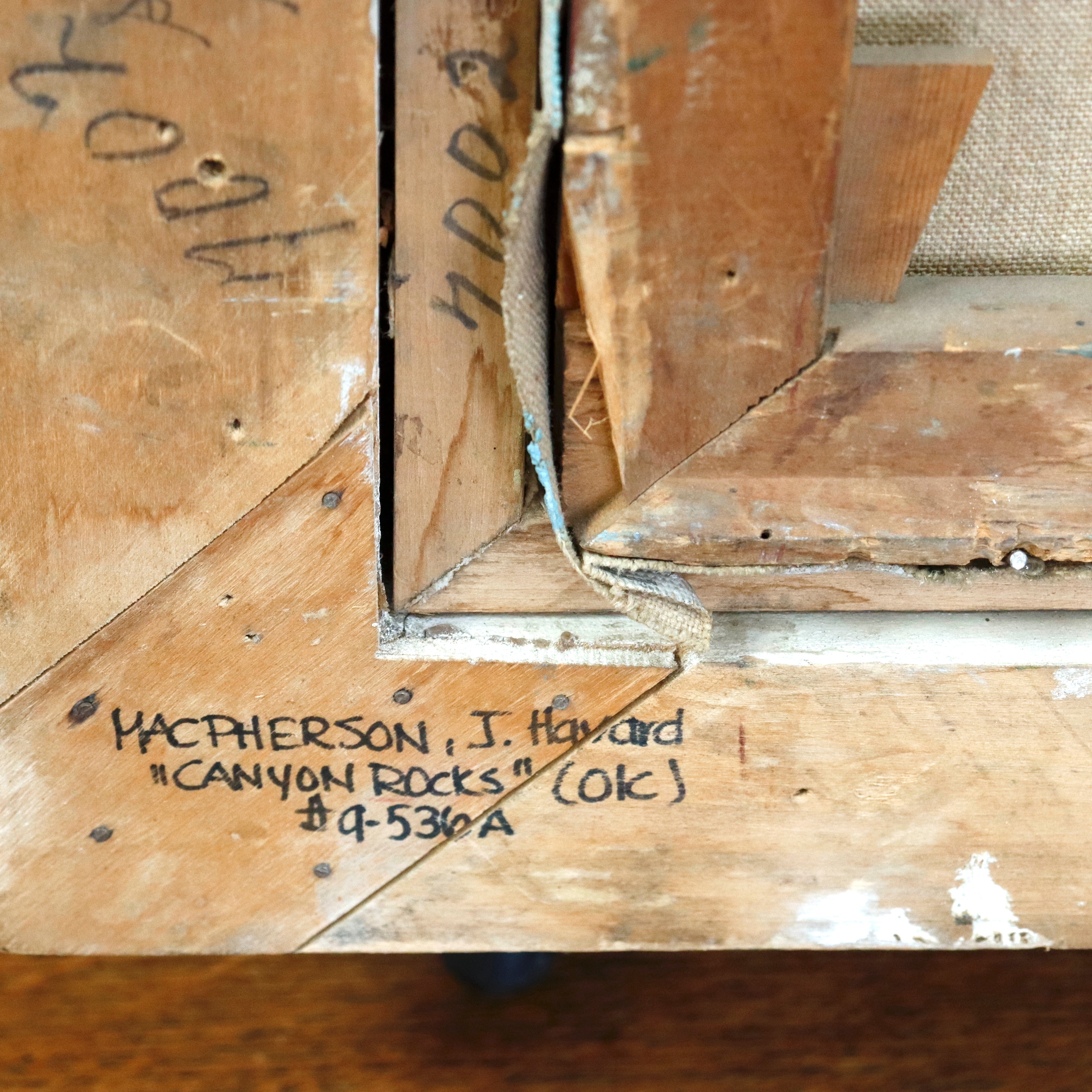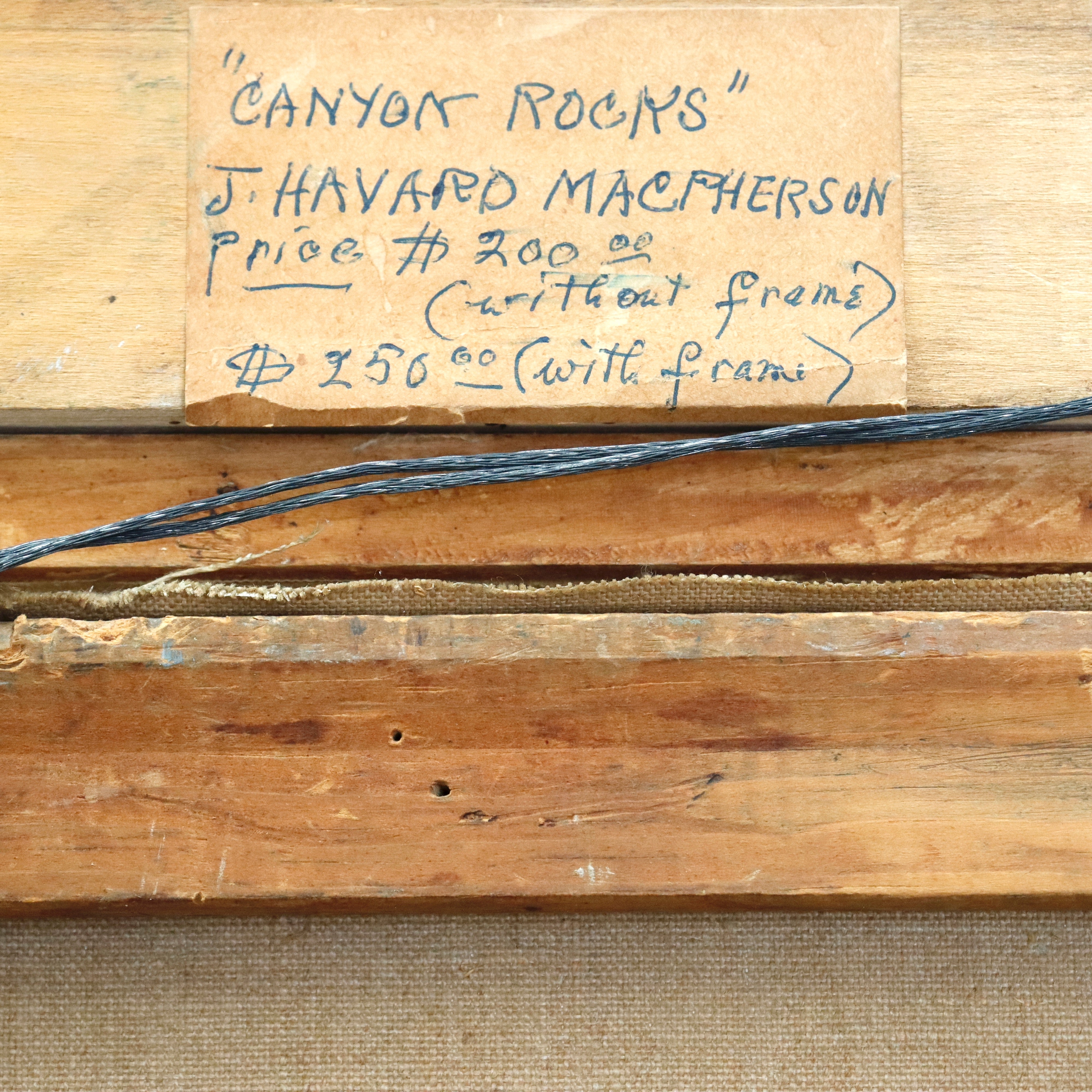 John Havard MacPherson Oil on Canvas Painting Presented in Original Newcomb Macklin Frame. Titled "Canyon Rocks". Signed lower left. Label verso reads "Canyon Rocks" J. Havard Macpherson Price $200 (without frame) $250 (with frame). Inscription on verso frame reads "Macpherson, J. Havard "Canyon Rocks" (OK) #9-536A". Frame verso stamped with "N.M. Co." which identifies the Newcomb Macklin frame.