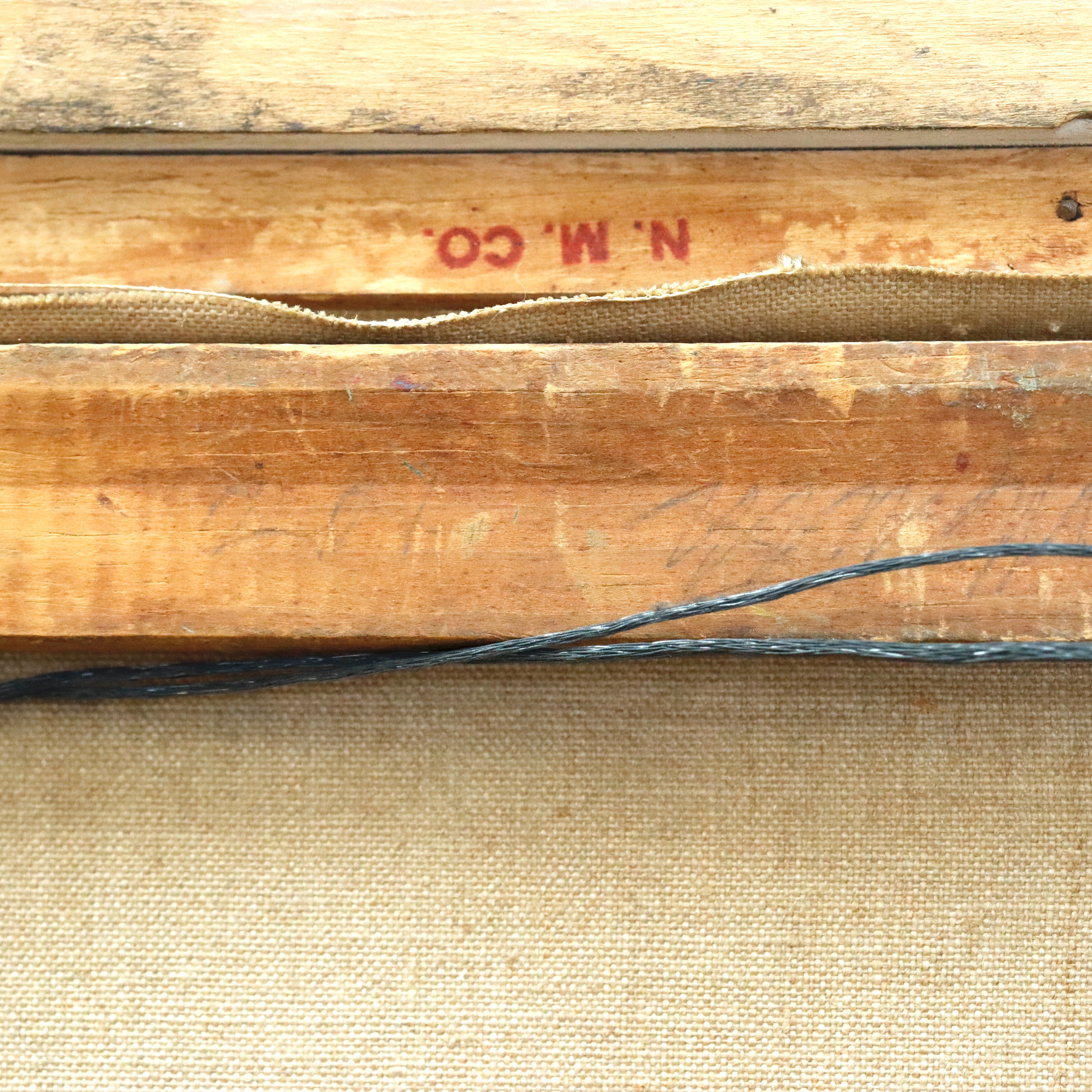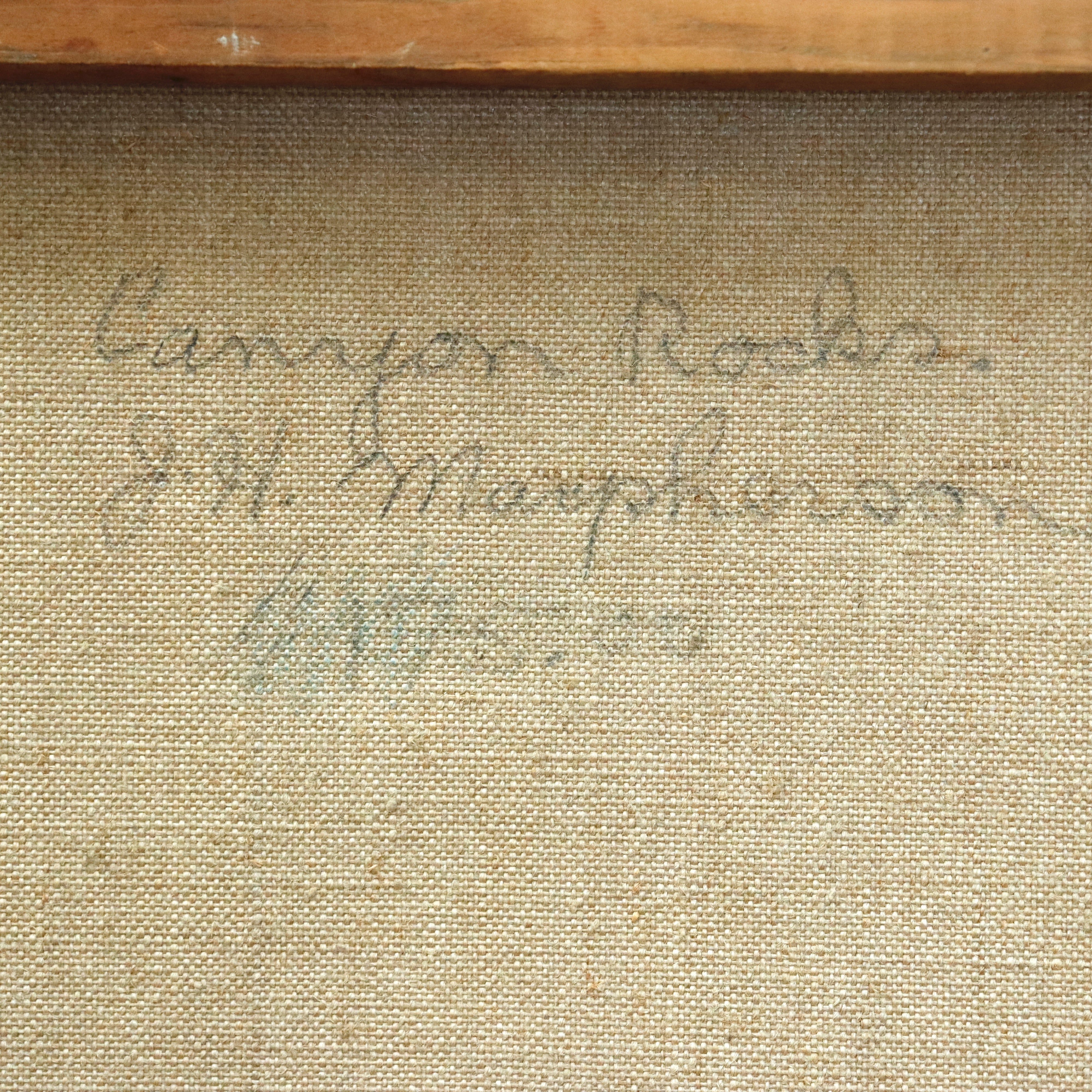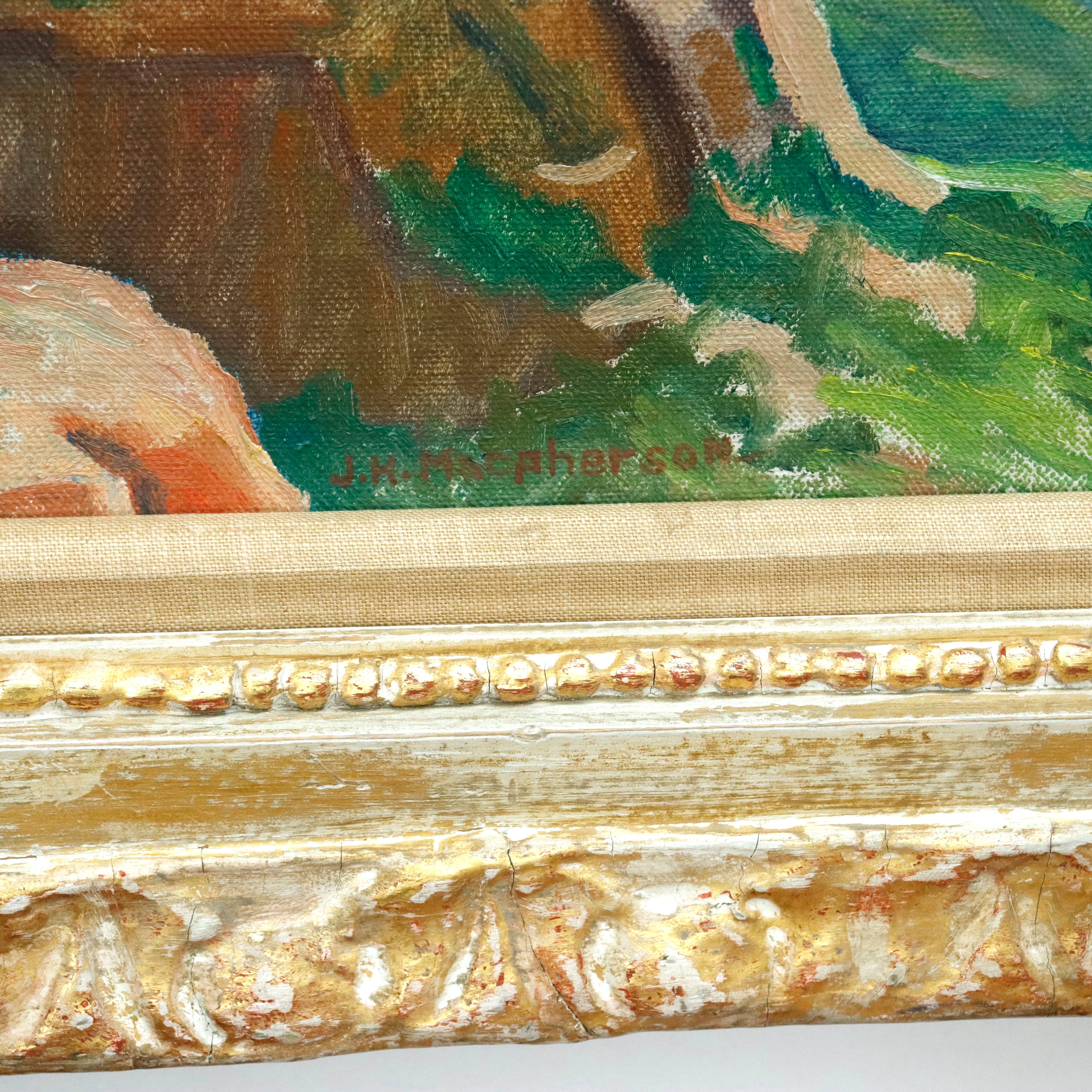 John Havard MacPherson Oil on Canvas Painting Presented in Original Newcomb Macklin Frame. Titled "Canyon Rocks". Signed lower left. Label verso reads "Canyon Rocks" J. Havard Macpherson Price $200 (without frame) $250 (with frame). Inscription on verso frame reads "Macpherson, J. Havard "Canyon Rocks" (OK) #9-536A". Frame verso stamped with "N.M. Co." which identifies the Newcomb Macklin frame.