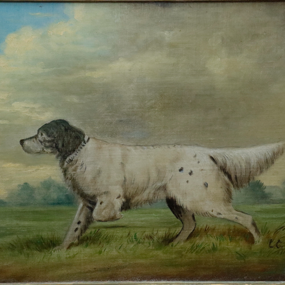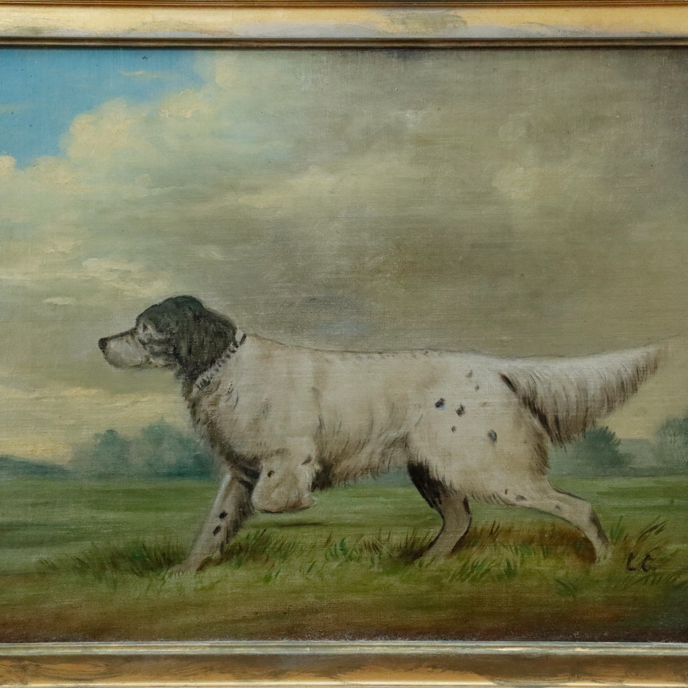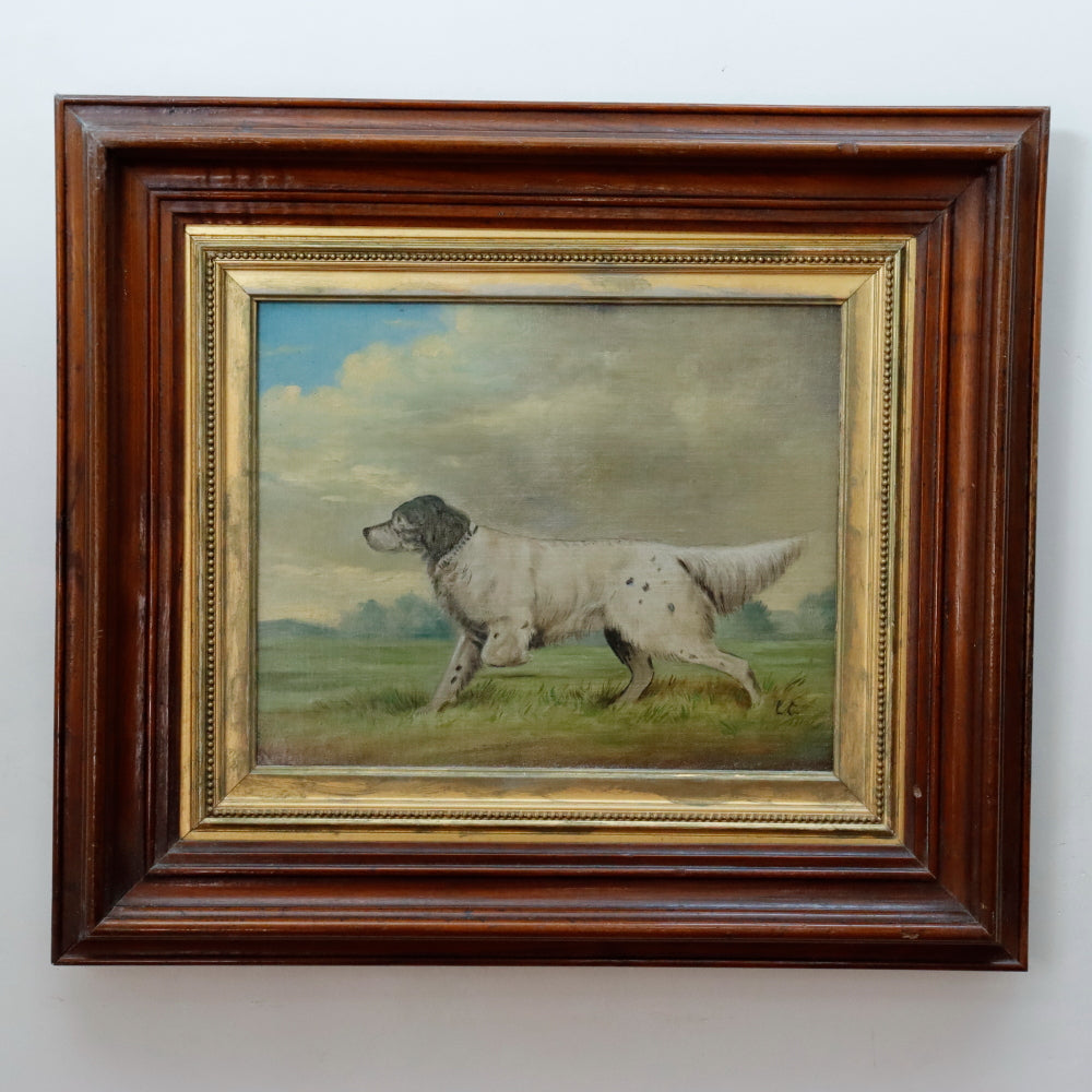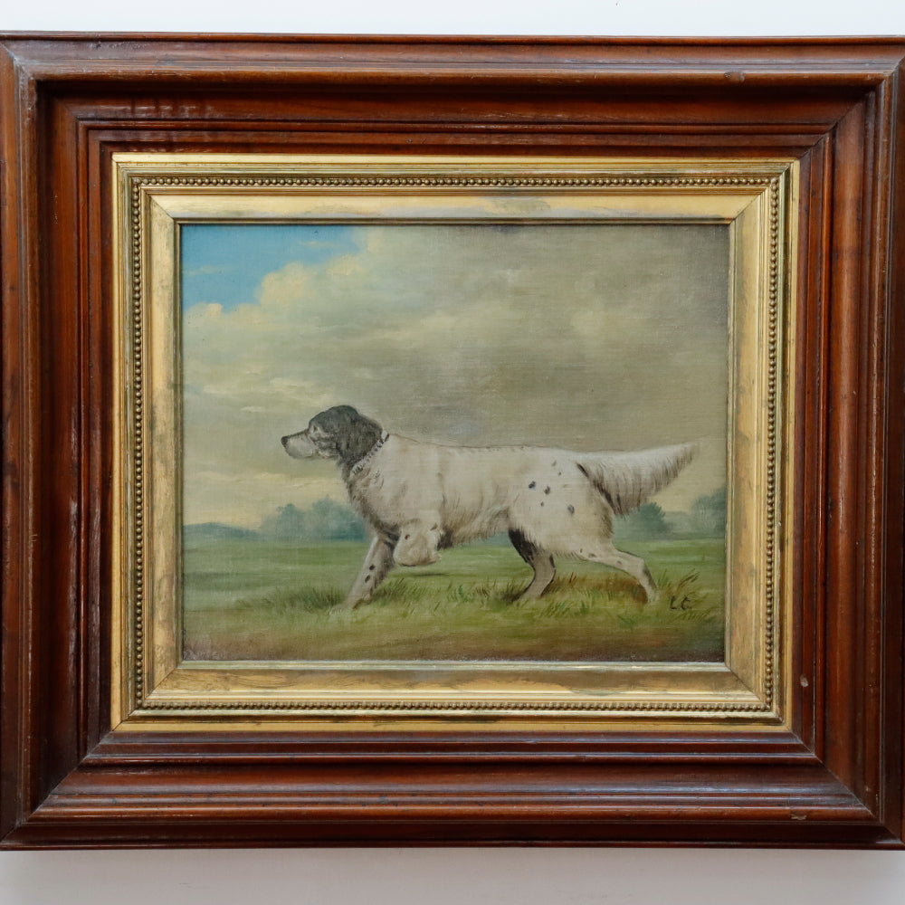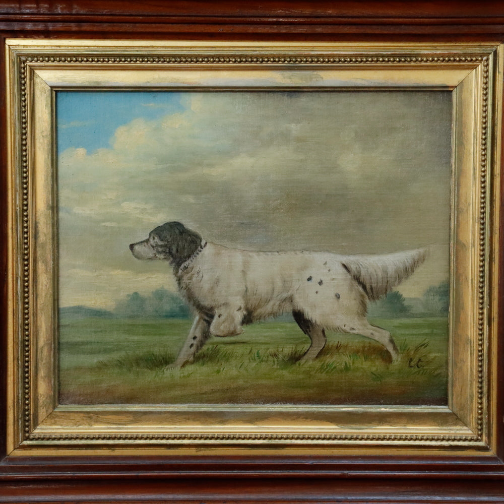 American School Antique Late 19th C Dog Portrait Oil on Canvas Laid to Mahogany Board. Signed "LC" lower right. Presented in Original Gilt Mahogany Frame