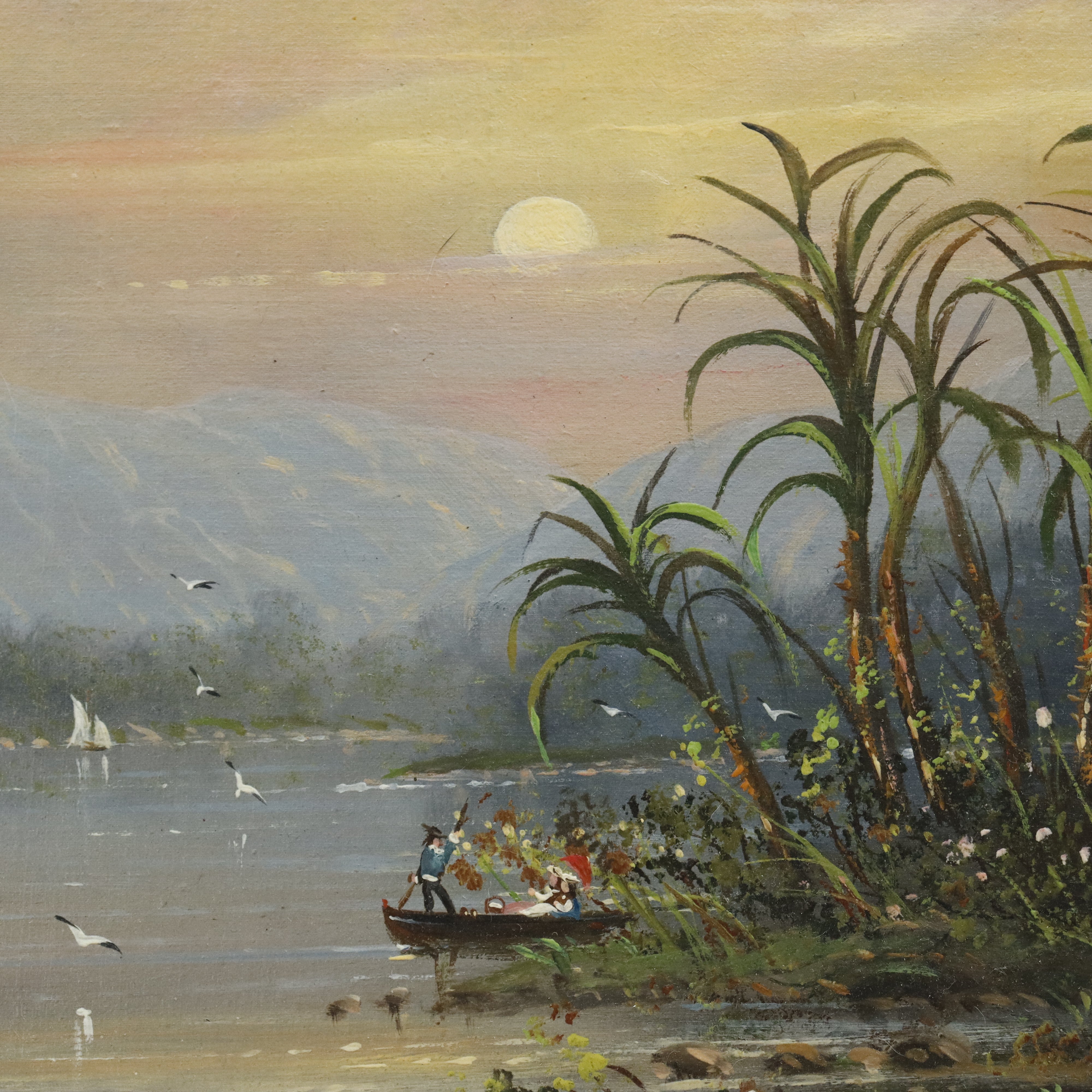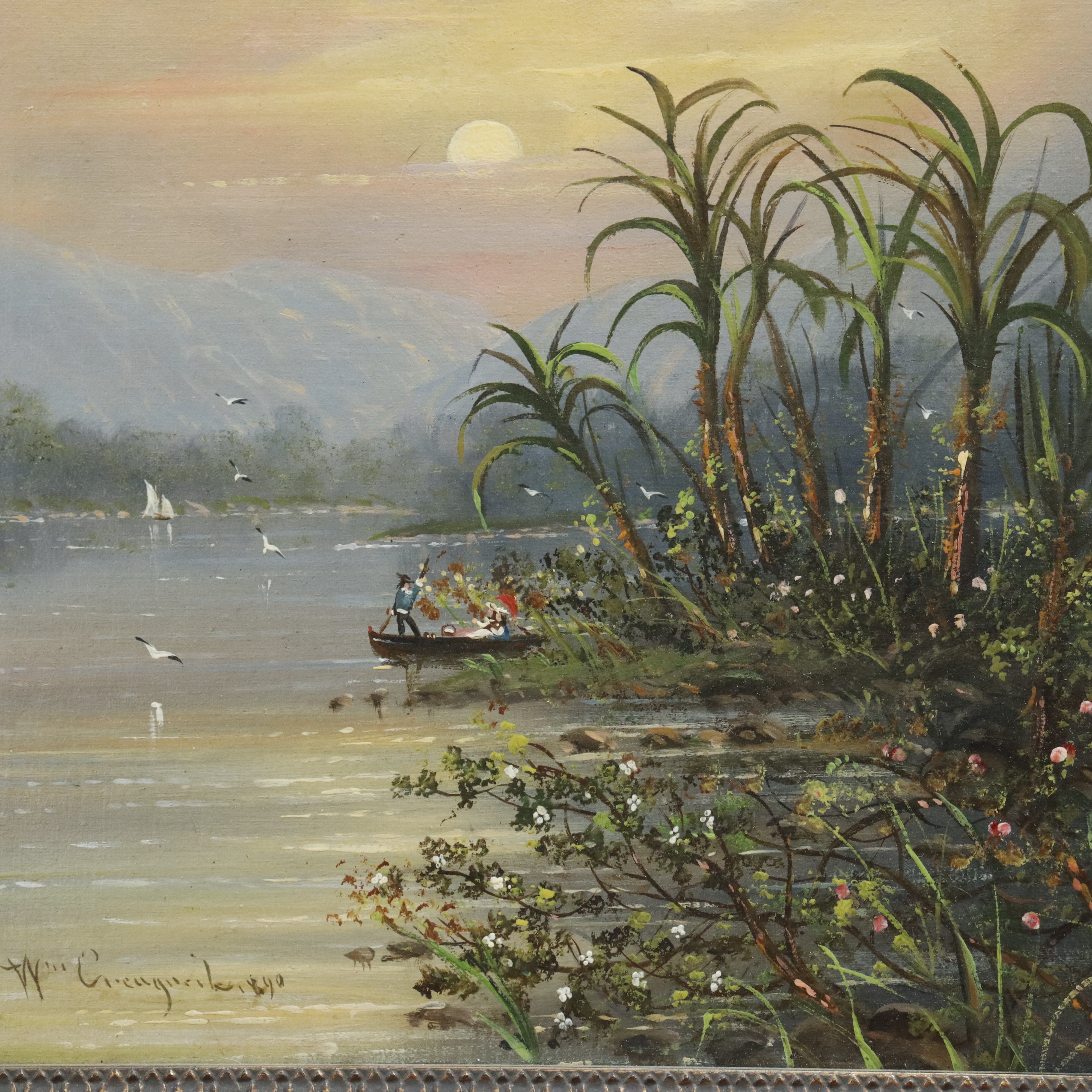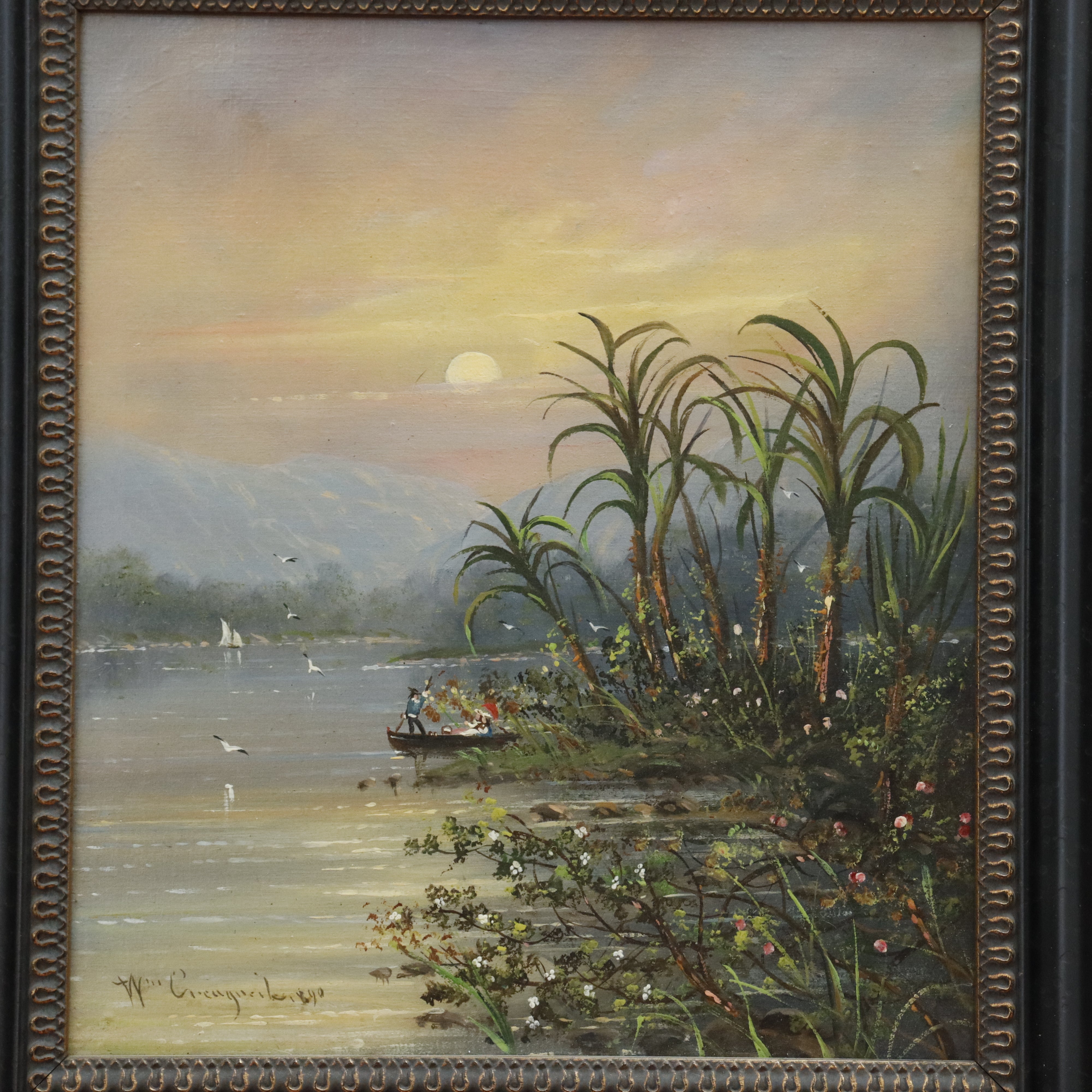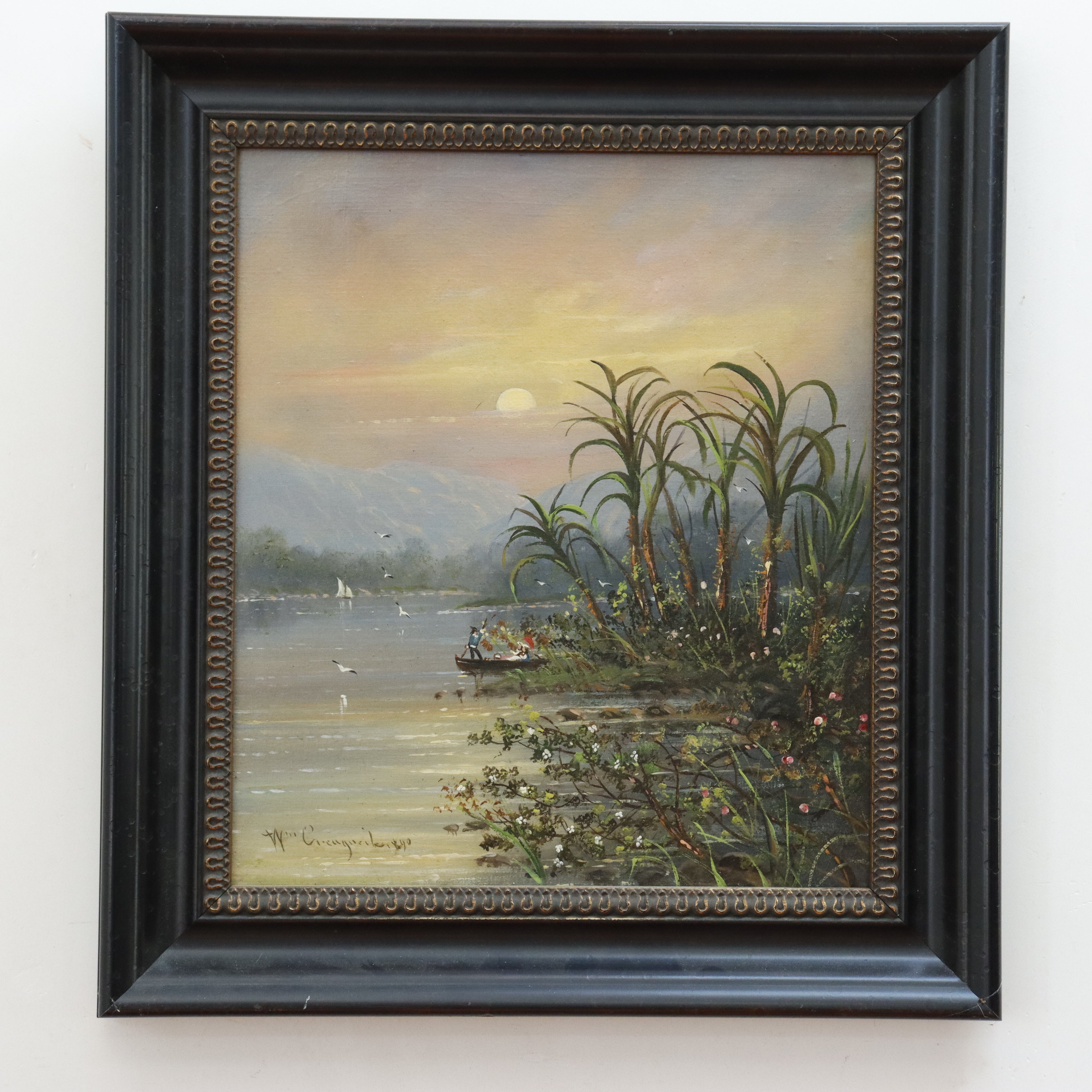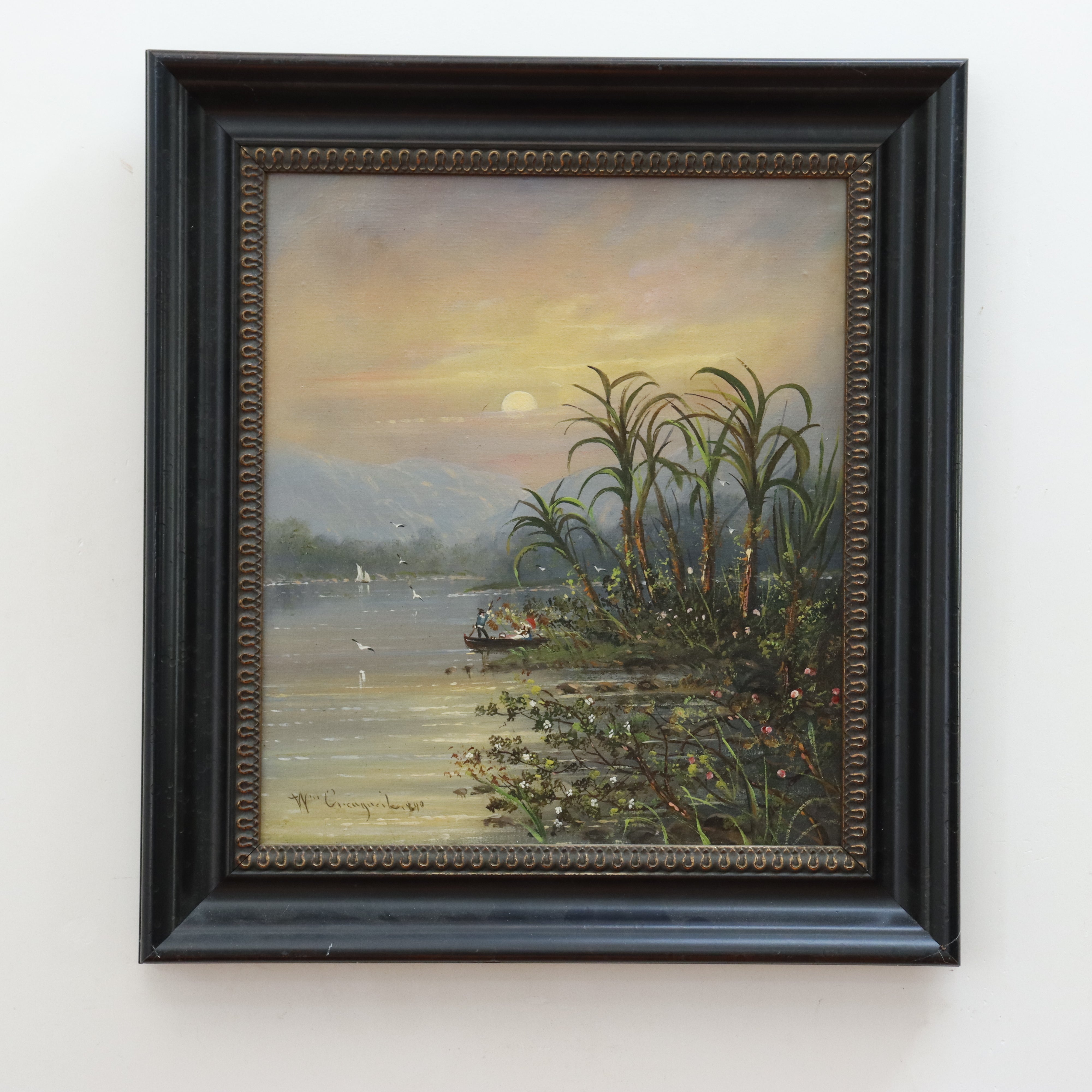 AW493: William Creaquile Boats At Sunset Oil on Canvas Painting