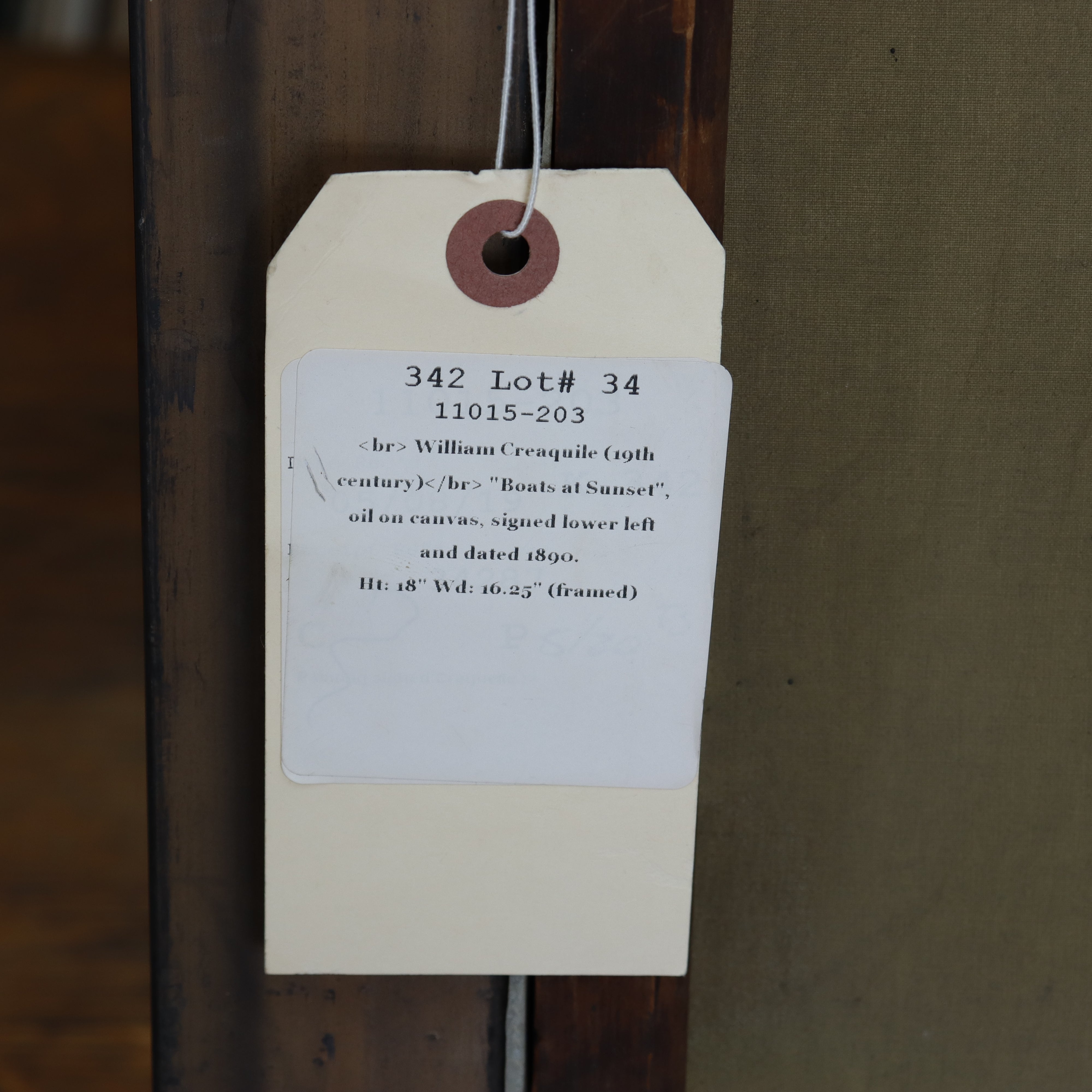 COMMENTS: William Creaquile (19th century) "Boats at Sunset", oil on canvas, signed lower left and dated 1890.