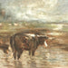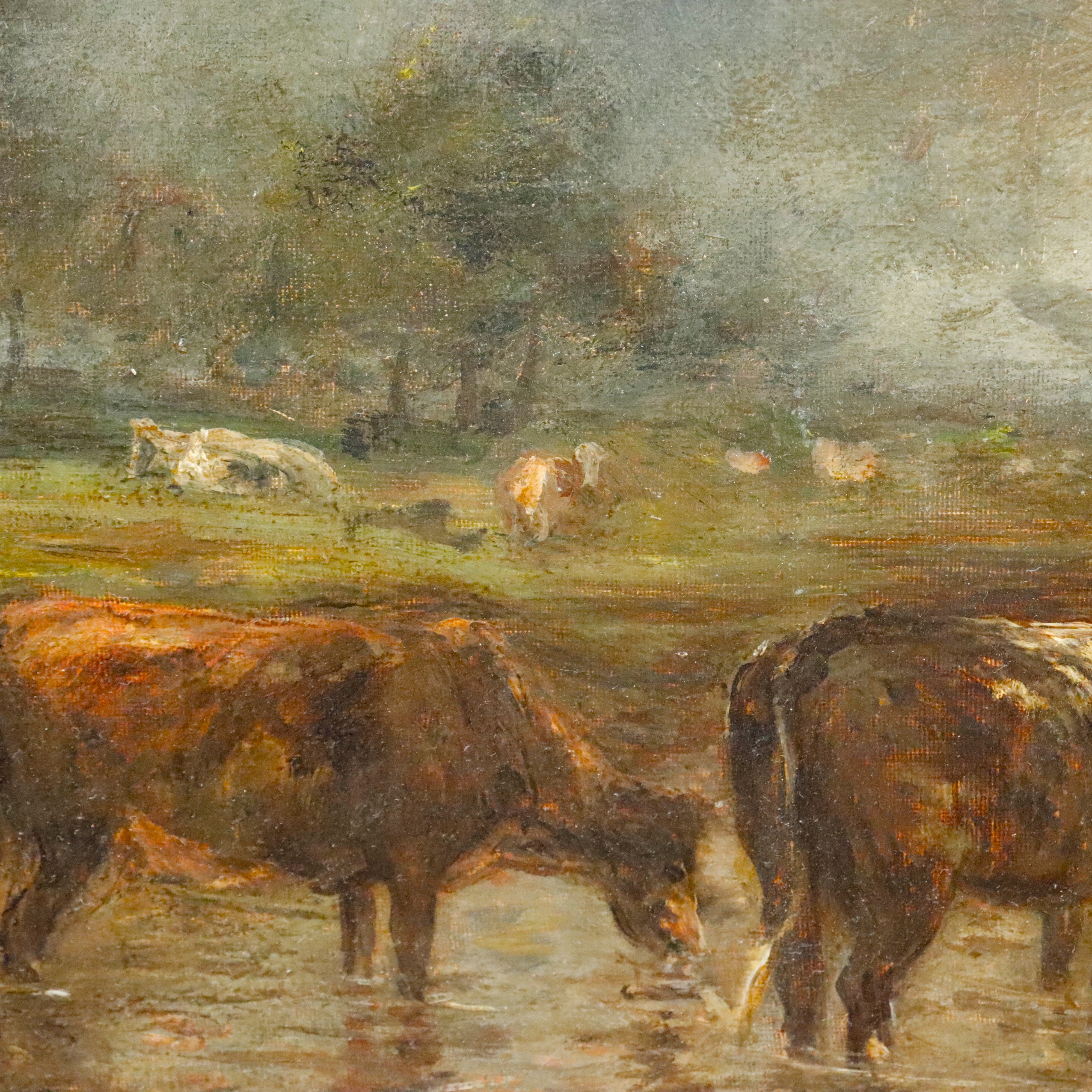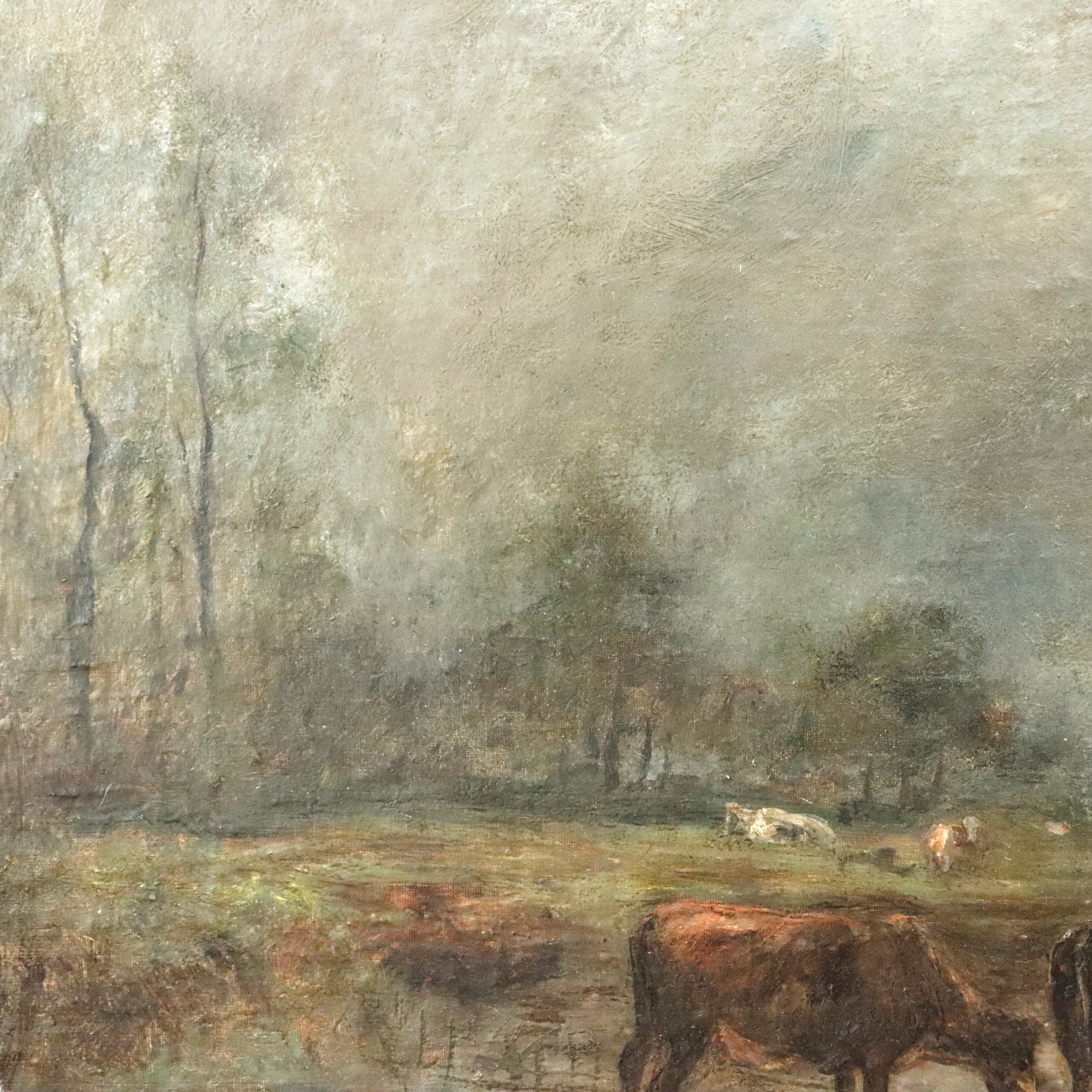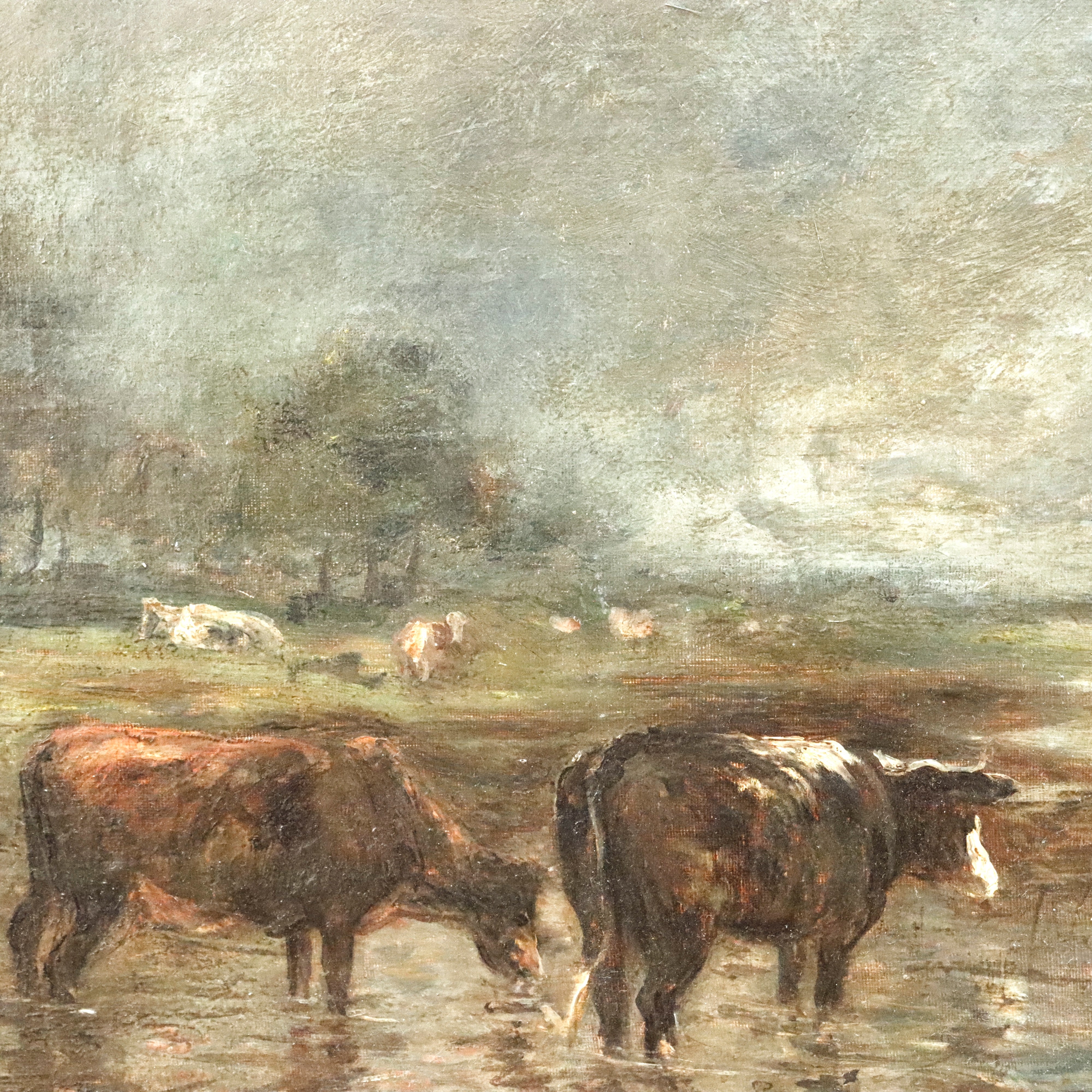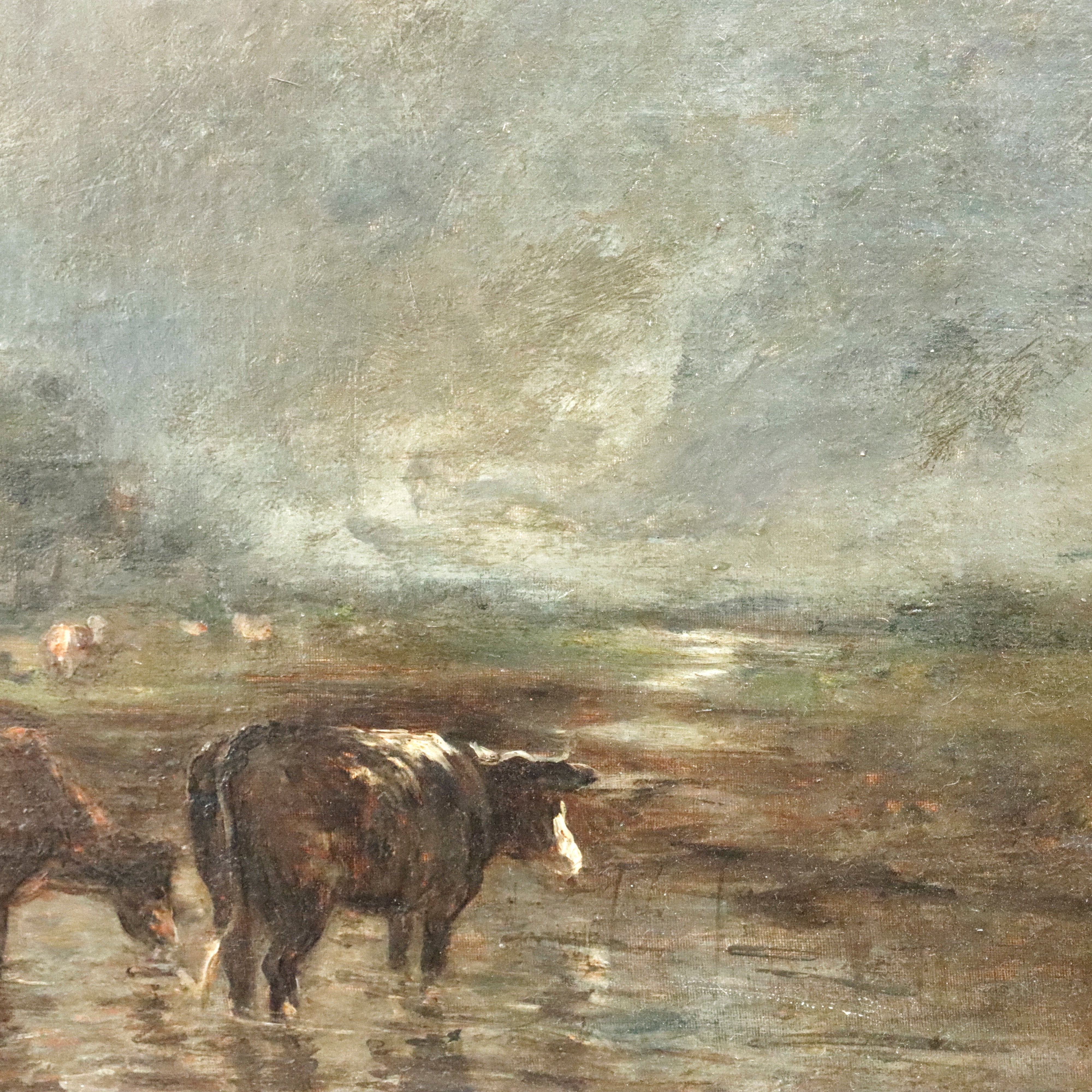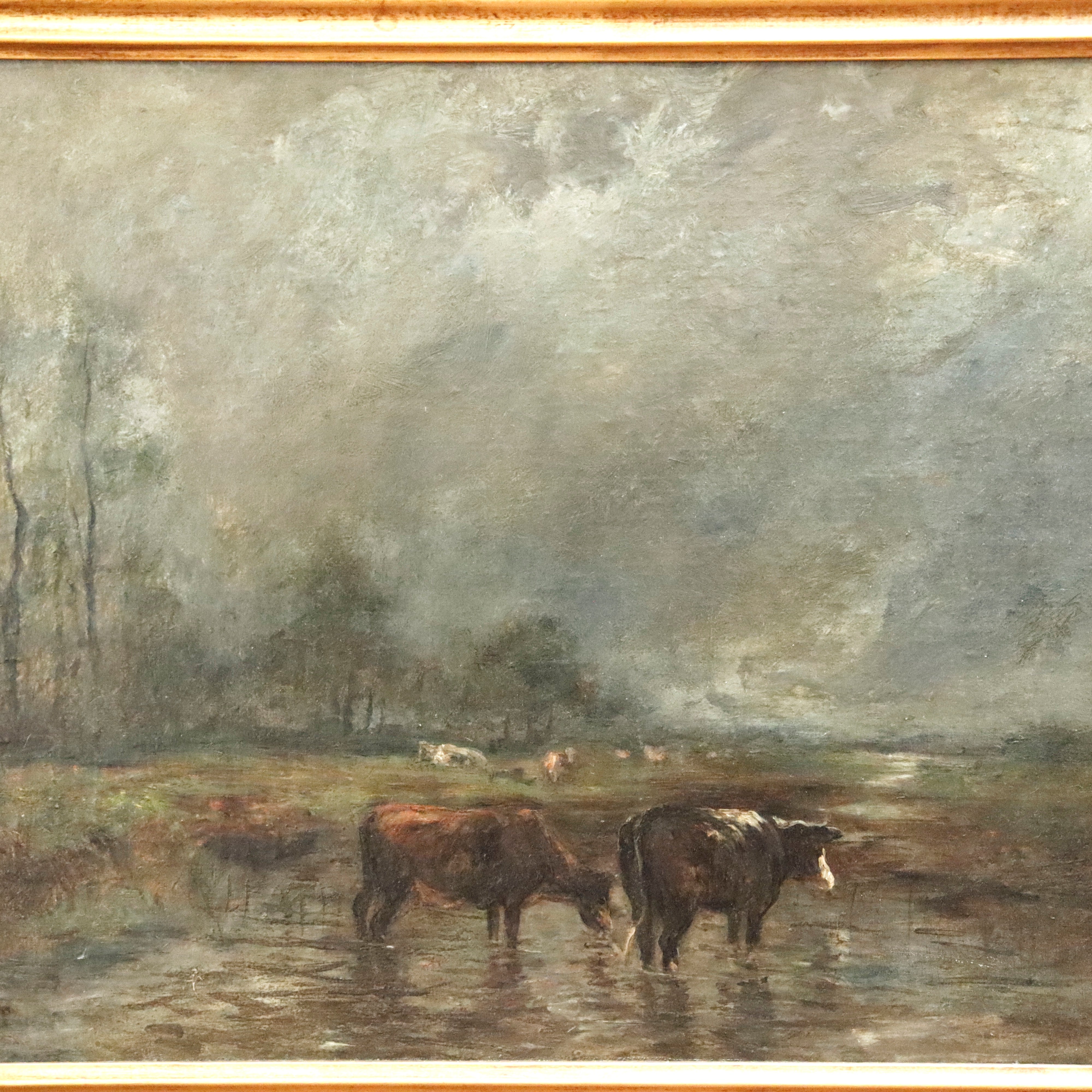 19th century Barbizon landscape - attributed to Constant Troyon. Cows in a river landscape. Oil on canvas mounted on panel. Monogrammed lower left. Estate stamp lower right. Framed. Sight: 19.5 x 23.5in. Overall: 25 x 28in.