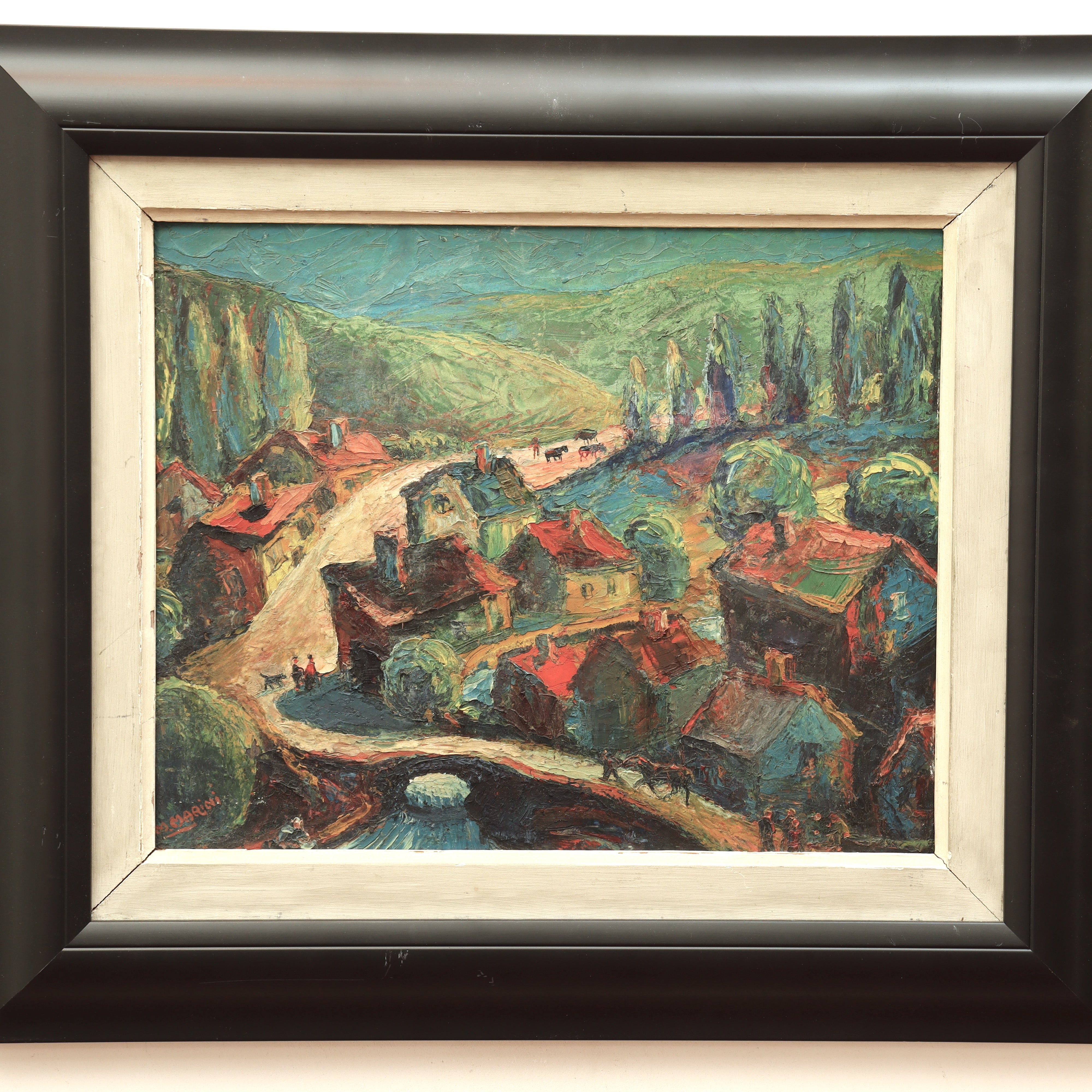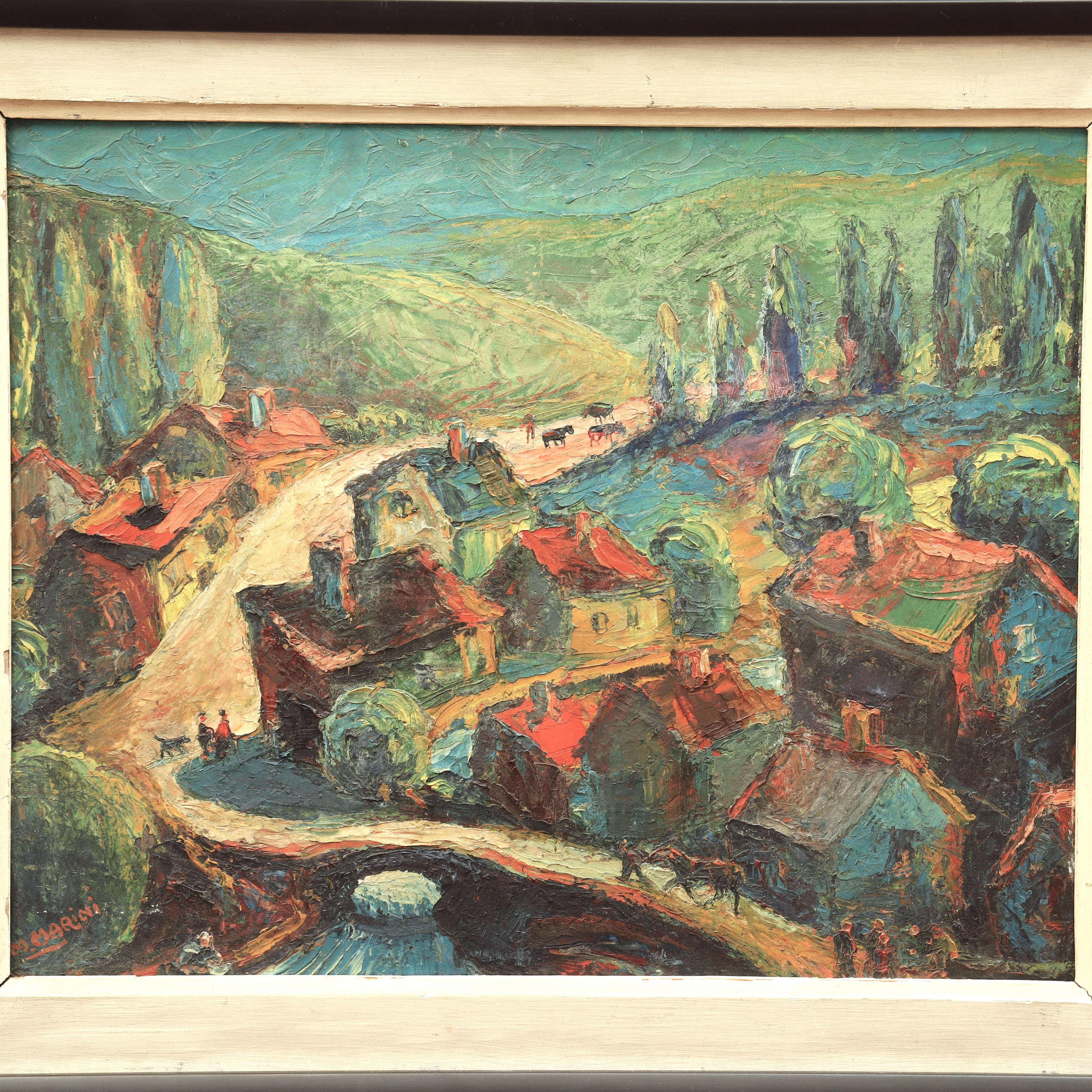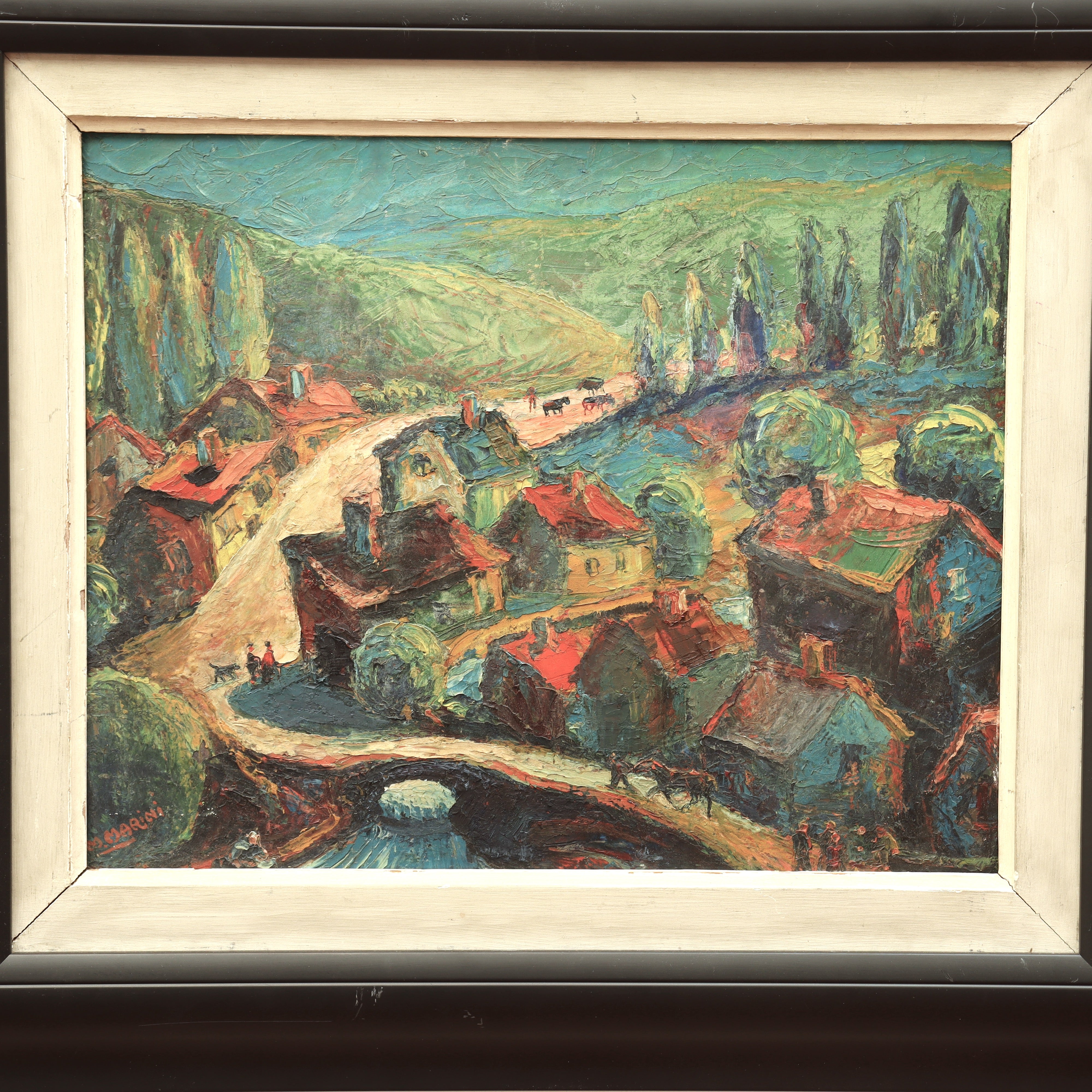 AW839: Marino Marini Modernist European Village Scene Oil on Board Painting
