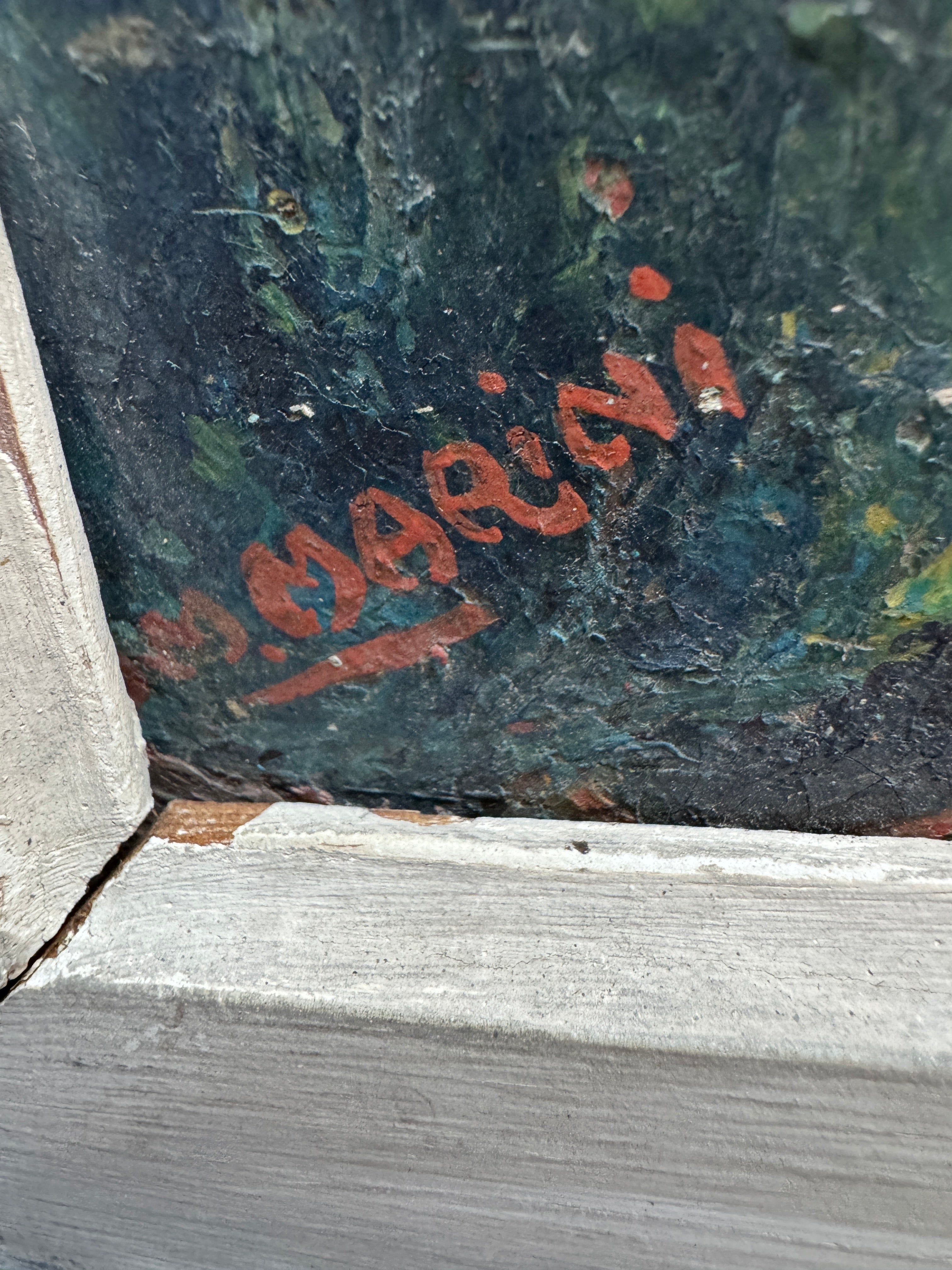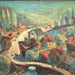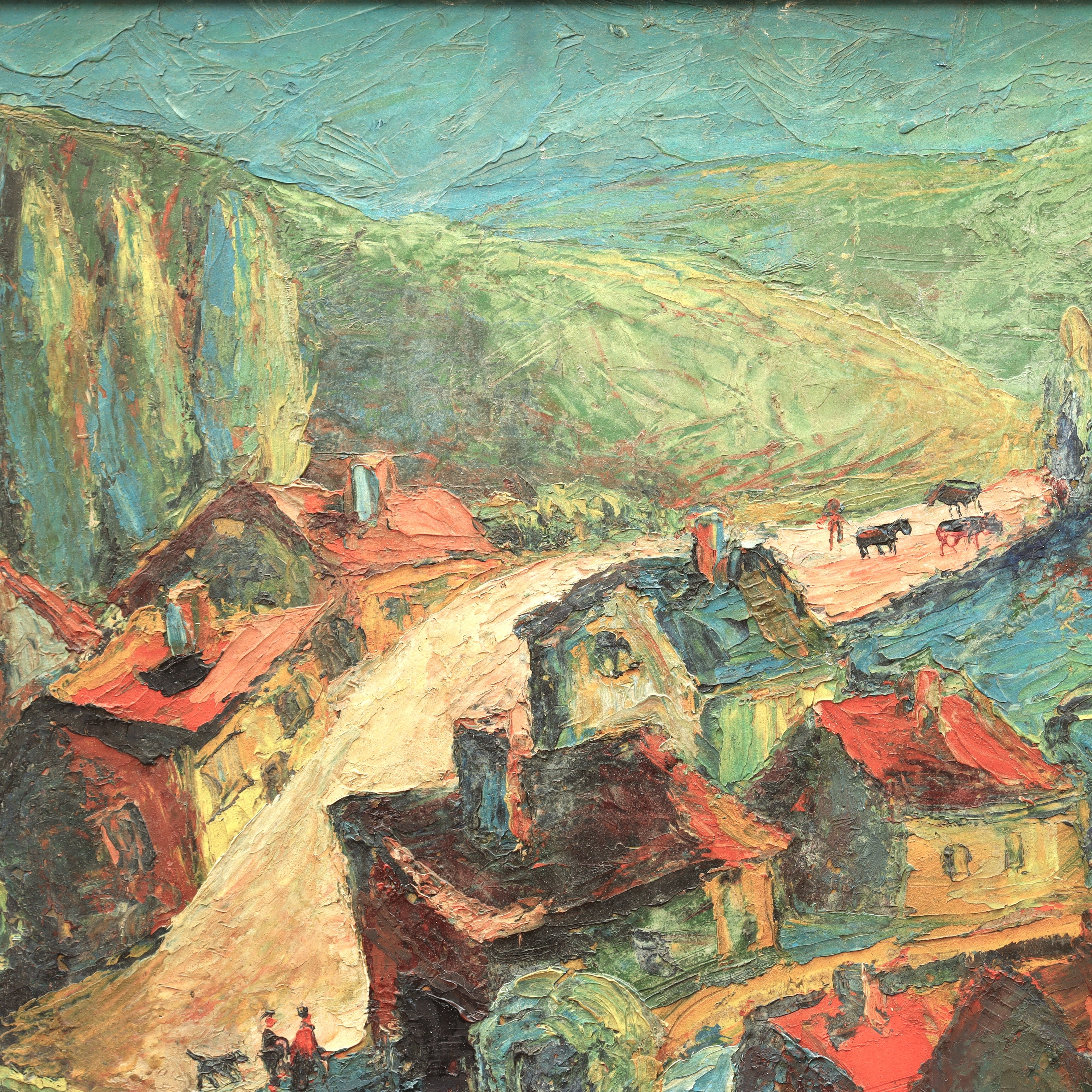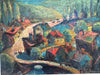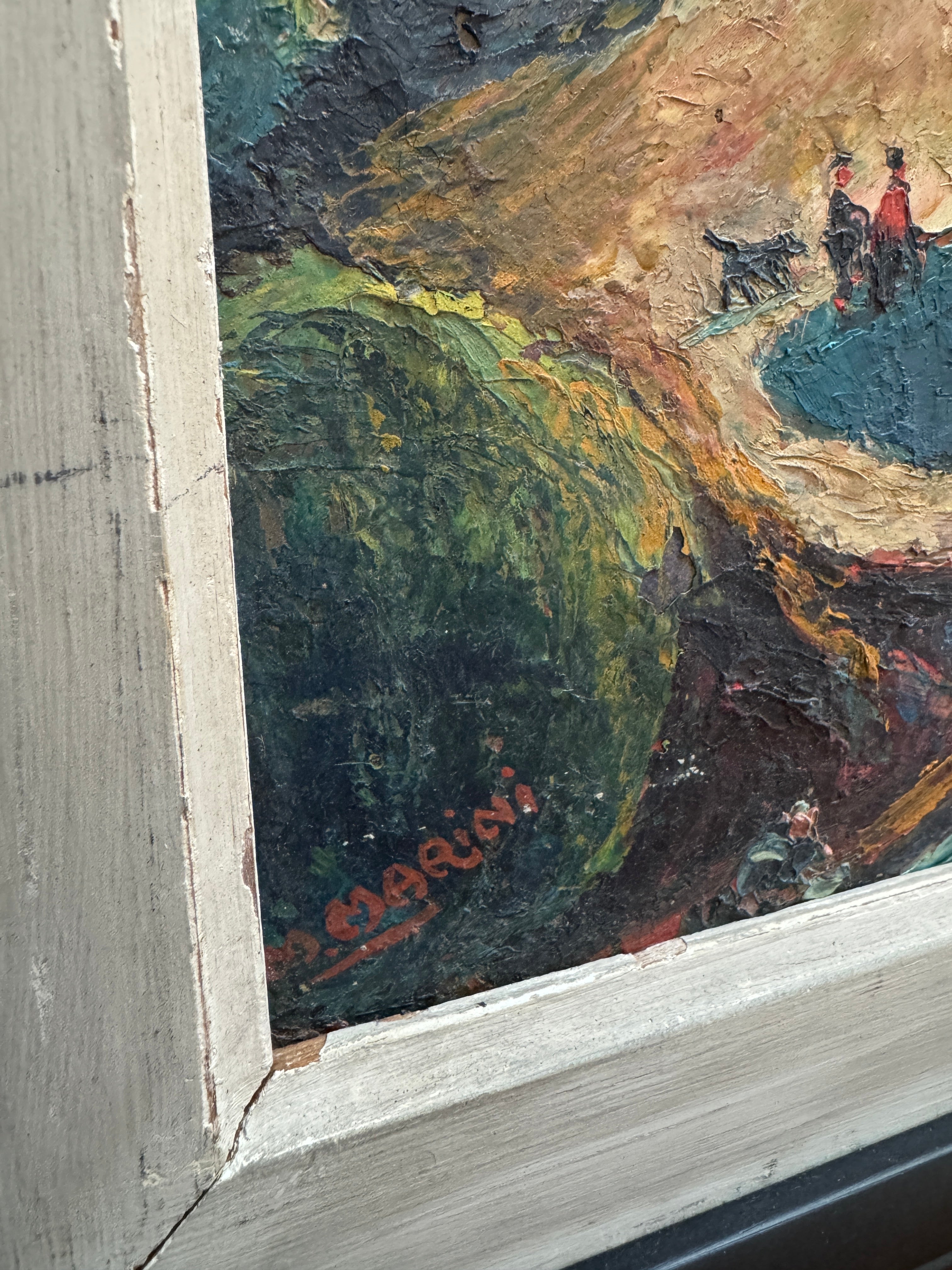 AW839: Marino Marini Modernist European Village Scene Oil on Board Painting