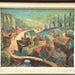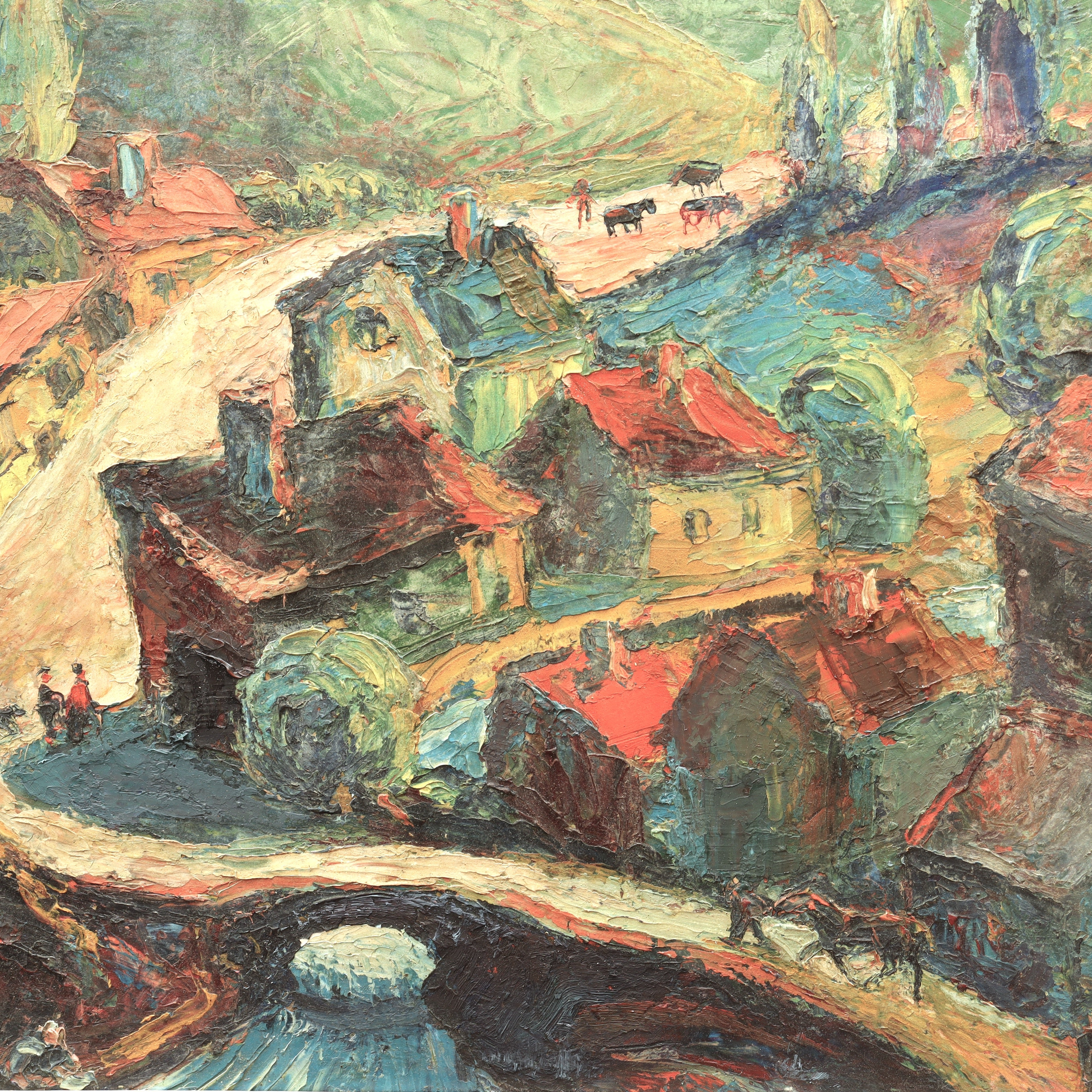 Marino Marini (Italian, Born 1901 Pistoia, Italy - Died 1980 Viareggio, Italy) Modernist European Village Scene Oil on Masonite Board Painting Signed lower left