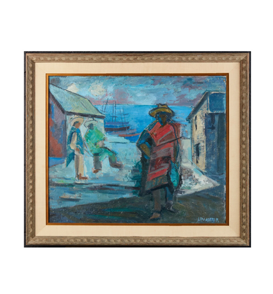 Fritz Schwaderer (American/California, 1901-1974) "Men on Dock" Expressionist Oil on Canvas Laid to Board Circa 1960's. Signed "SCHWADERER" lower r...