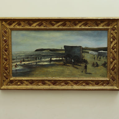 Mid 19th Century Seaside Oil on Canvas Laid to Board. Indistinctly signed lower right. Tag on verso reads: "THE MEDICI SOCIETY LTD. 26 THURLOE ST.,...