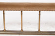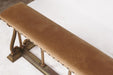 Antique late 19th C cast brass fireside bench w/ lyre form supports & brown upholstered seat with nail head trim. Dimensions: 72" wide x 12" deep x 21" high