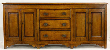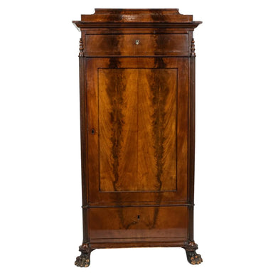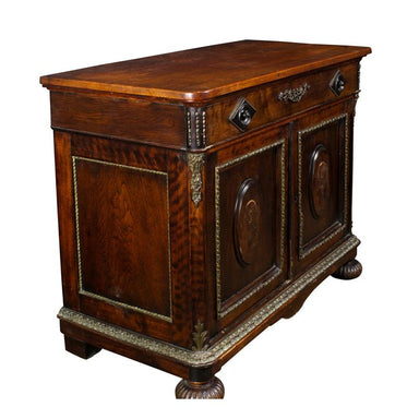 Early 19th Century English Regency Rosewood Console with Gilt Metal Mounts. Central drawer over single door cabinet flanked by step-back single doo...