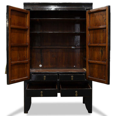 Late 19th Century Chinese black lacqer coffer/wedding chest, double hinged door above two drawers, inside with three shelves and four drawers, appr...
