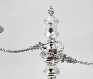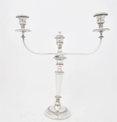 Late 19th century pair of English silverplate convertible three light candelabra. DIMENSIONS: Height 18" (46cm); Width 16 1/4"(41cm); Depth 5 1/2" ...