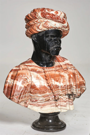 Early 20th Century Continental Variegated Red & Black Marble Bust of a Moor. Dimensions: Height 28" (71cm); width 21" (53.5cm); depth 10 1/2" (...