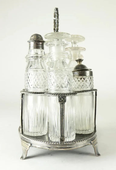 George III Sterling Silver Cruet Set, John Emes, London, Circa 1802, the stand decorated with gadrooning and fluted feet, including (6) cut glass b...