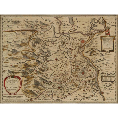 TITLE: Circa 1653 Map of France FRAME: COMMENTS: La Principaute´ d'Orange et comtat de Venaissin by Johannes Jansson. Hand coloring appears early...