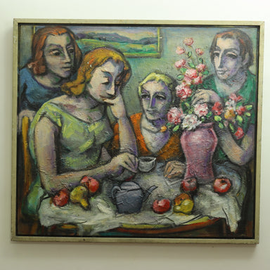Samuel Heller (1902 - 1997) "Girl Talk" Oil on Canvas - Original oil on canvas set in wood frame. Subject is four women around a table with fruit a...