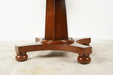 Late 20th C American Late Classical 54" Round Mahogany Pedestal Dining Table. Solid mahogany top rising on hexagonal tapered pedestal supported by a four pronged outstretched base supported on four bun feet. Retains what looks to be the original fine French Polish finish.