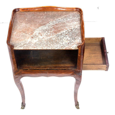 Late 8th Century French Louis XV Kingwood Marquetry commode having a marble top, above a lower tier , and rising on cariole legs, 27"h x 16"w x 12"d