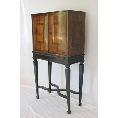 Napoleon III Console Cabinet. Ebonized and burl veneer body, central two door cabinet with inlaid decoration, flanked by curved display shelves wit...