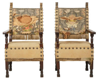 Pair of Large Mid 18th C Walnut Spanish Baroque Hall / Throne Armchairs w/ Large Brass Nail Heads. Needing new upholstery. Dimensions: 52" x 26" ...