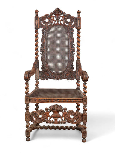 Antique 18th Century Jacobean Baroque Carved Walnut Arm Chair With Caned Seat & Back and Barley Twist Turnings