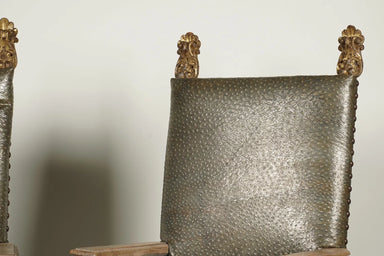 Pair of Mid 18th Century Spanish Baroque Walnut Open Arm Chairs Dimensions Width - 25-1/2" Depth - 21" Height - 43" Nailed and embossed leather b...