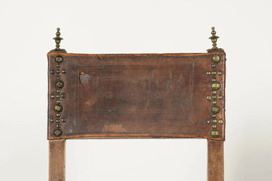 Antique Pair Spanish Colonial Tooled Leather Walnut Side Chairs with brass nail heads and finials. Early 19th Century. 1st Chair Dimensions: 41" x ...