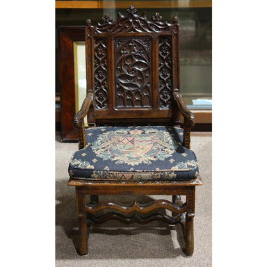 Louis XIII Revival Armchair, Flemish Tapestry Upholstery. Scroll carved arms and legs with a curved H stretche, slight curve to crest rail. Foliate...
