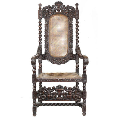 Antique 18th Century Jacobean Baroque Carved Walnut Arm Chair With Caned Seat & Back and Barley Twist Turnings Dimensions: height 54" (137cm);...
