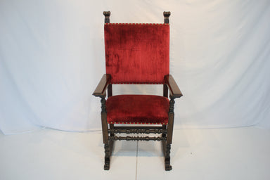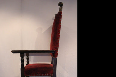 Antique Pair of mid18th C Spanish Baroque Carved Walnut Upholstered Arm Chairs w/ Decorative Brass Tacks Over Worn Red Velvet. Beautiful patinaed a...