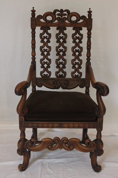 Antique Late 19th Century Charles II Style Carved Walnut Open Arm Chair with brown velvet upholstery and eight way hand tied coil foundation spring...