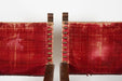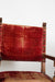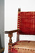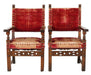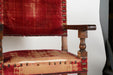 Antique Pair of mid18th C Spanish Baroque Carved Walnut Upholstered Arm Chairs w/ Decorative Brass Tacks Over Worn Red Velvet. Beautiful patinaed aged walnut wood. Intricate carved pierced stretcher bars. Hand molded brass tacks.