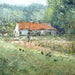 Felix Carpentier - Rural Farmstead - Oil on Mahogany Wood Panel. Signed "Felix Carpentier" and dated "1916" lower right. A rural farmstead scene with chickens in the foreground and a figure outside farm buildings. Very good condition. Examination under black light reveals minor inpainting along the extreme upper left edge approximately 1/2 in from the edge and 3 inches in total length along that edge. No other inpainting, touch-up, repair. No damage or loss.