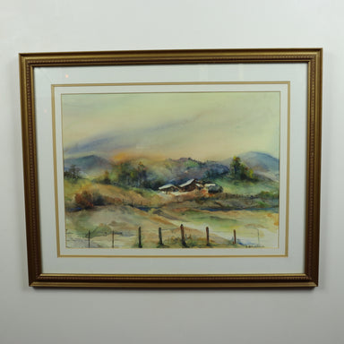 Late 20th Century watercolor on paper titled "Ranch at Creeks Bend". Artist Doris Bruchler. Dimensions: Frame - 24 1/2" x 30 1/2"; Sight - 16" ...