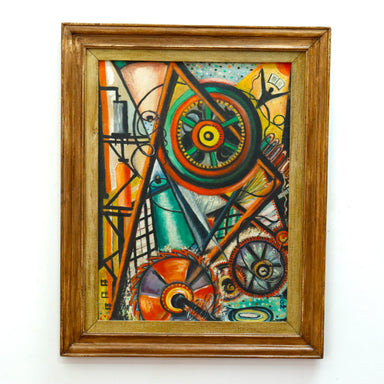Jean G. Noll Avant Garde Constructionist Composition Oil on Board Painting. Signed "JGN" lower right. Presented in a period wood frame. Inscription...