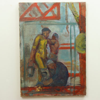 Circa 1937 Russian Avant Garde Oil on Canvas Painting of Construction Workers. Signed in crylic on verso - translates to "V. Viktorovskii". Dated 1...