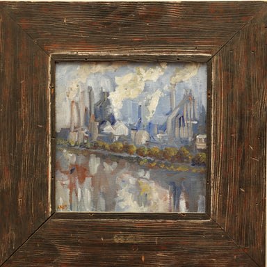 American School Riverside Industrial Zone Oil on Canvas Circa 1970's Signed AMOS lower left Dimensions: Sight 10" x 10"; Frame 17" x 17"