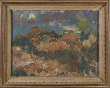 Carl Zimmerman "Autumn Twilight” Early 20th Century American WPA Modernist Landscape Oil on Board Painting . Presented in a vintage frame Dimensio...