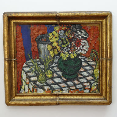 Sacha Moldovan Still Mid Century Modernist Life Vase of Flowers on Checkered Table Cloth Oil on Canvas. Signed stretcher bar verso. Dated "1963" an...