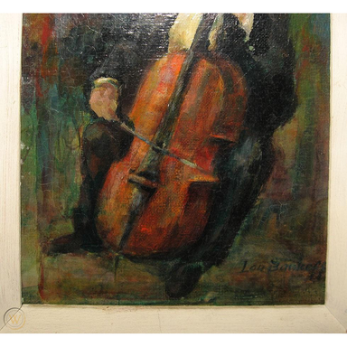 TITLE: Man Playing Cello FRAME: COMMENTS: Outstanding oil on canvasboard of a man playing the cello by listed Rockport, Massachusetts artist Lou Ba...