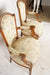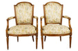 Pair of Late 19th C French Louis XVI Style Carved Walnut Fauteuils with cream-colored floral-patterned fabric. Dimensions: Each 24 inches wide; 20 1/2 inches deep; 36 inches high; seat height: 15 1/2 inches