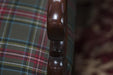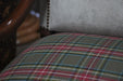 Vintage Pair of Late 20th Century Louis XIV Style Walnut Upholstered Armchairs, each having scrolled arms. Tartan plaid fabric seats and suede leather backs.