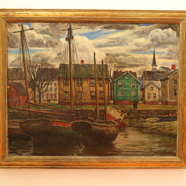 George Macrum New England Fishing Port Oil on Board Painting. WPA artist Presented in the original artist's frame. Inscriptions verso: "New England...