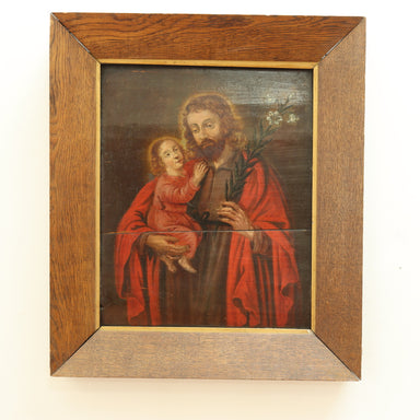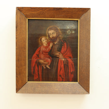 18th Century European School - Joseph Holding Infant Christ - Oil on Board. Housed in antique oak frame with gilt liner. Dimensions: Sight: 17" x ...