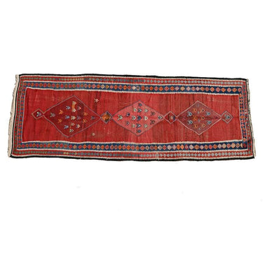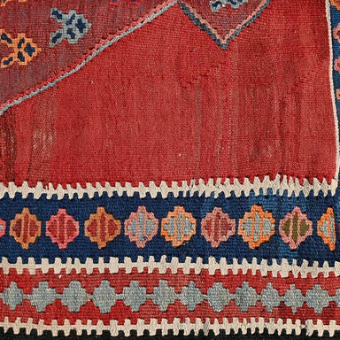 Flat Woven Baluch Kilim. Three diamond medallions on a red ground, blue main border with red outer border and black edge; orange, red, blue, green,...