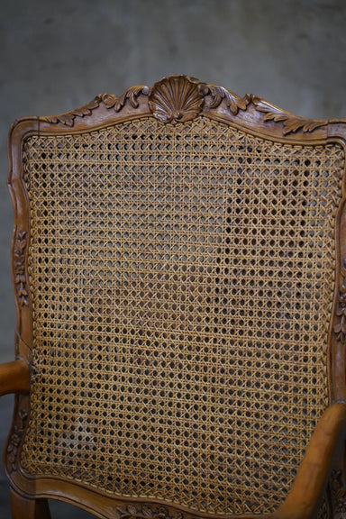 Antique Pair Carved Walnut Louis XV French Provincial Caned Fauteuils Late 19th Century Dimensions: 44" high; 26" wide; 21" deep